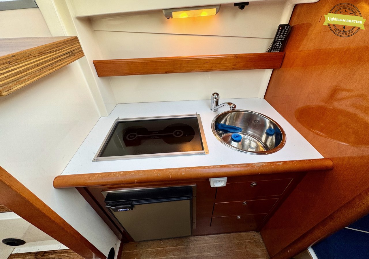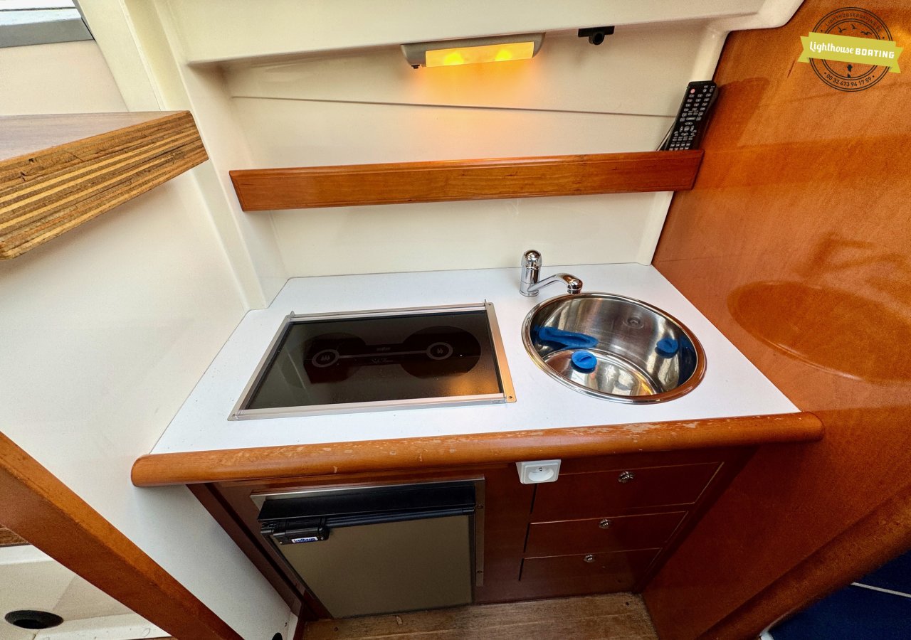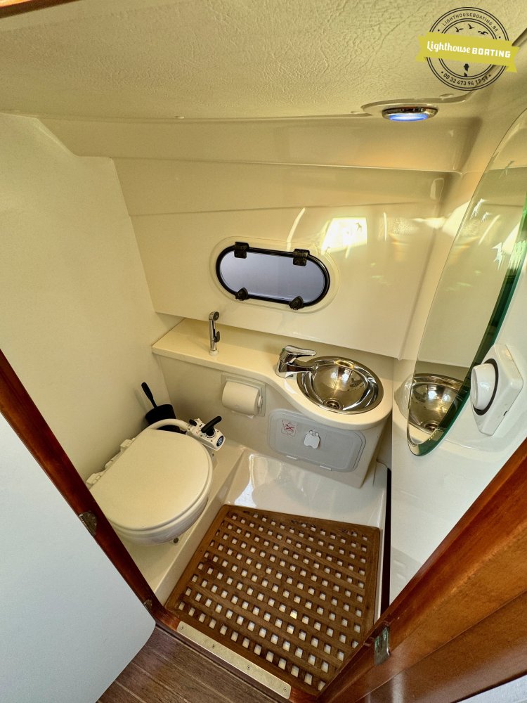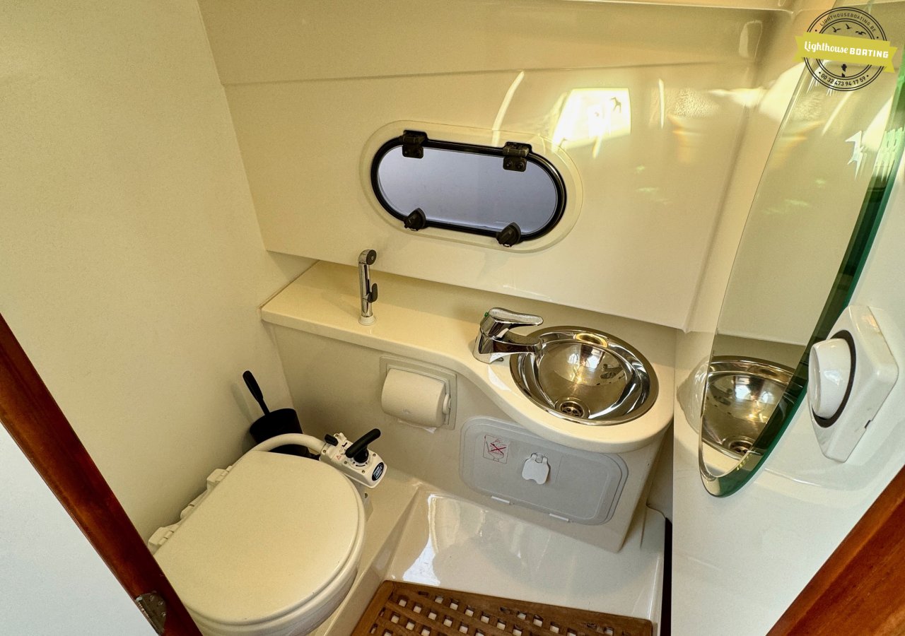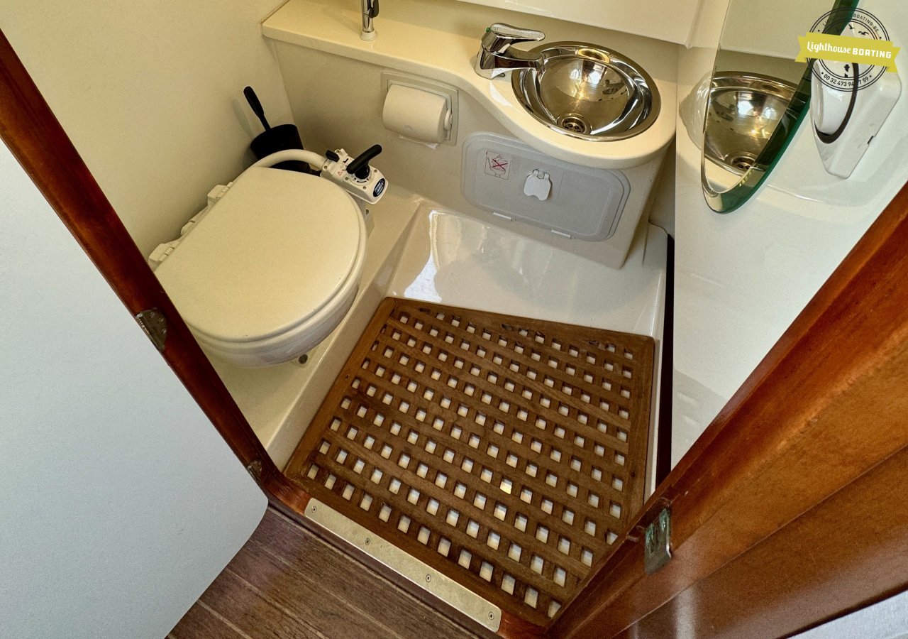 The Aquador 25C offers sleeping accommodations for four people: two adults in the forward cabin and additional sleeping space for children in the salon. The interior features a separate toilet area with a Jabsco marine toilet with a holding tank, a sink, and a shower. The wheelhouse is equipped with comfortable swivel seats, ideal for relaxing while sailing or at anchor.