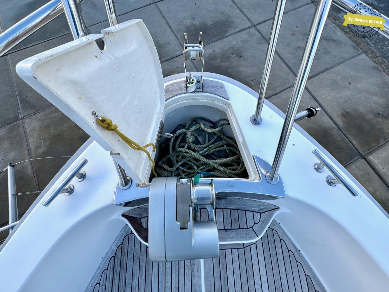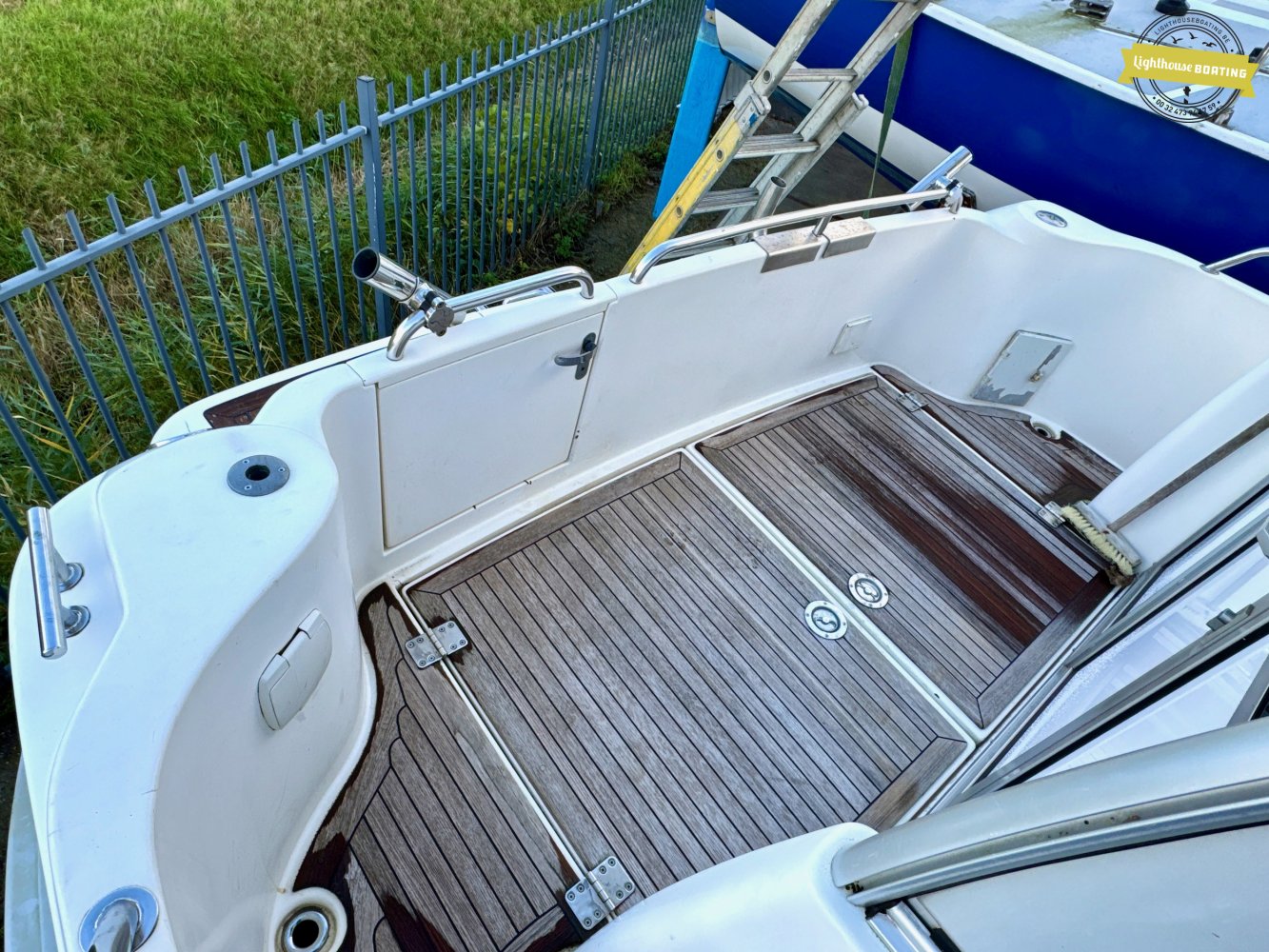 The deck is finished with teak on the foredeck, gangways, aft deck, and swim platform, contributing to the luxurious appearance. The boat is equipped with an electric anchor winch, several fenders, and mooring lines. The swim platform has an integrated stainless steel ladder and storage space.