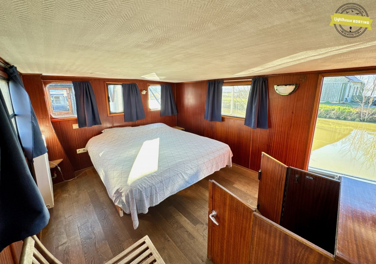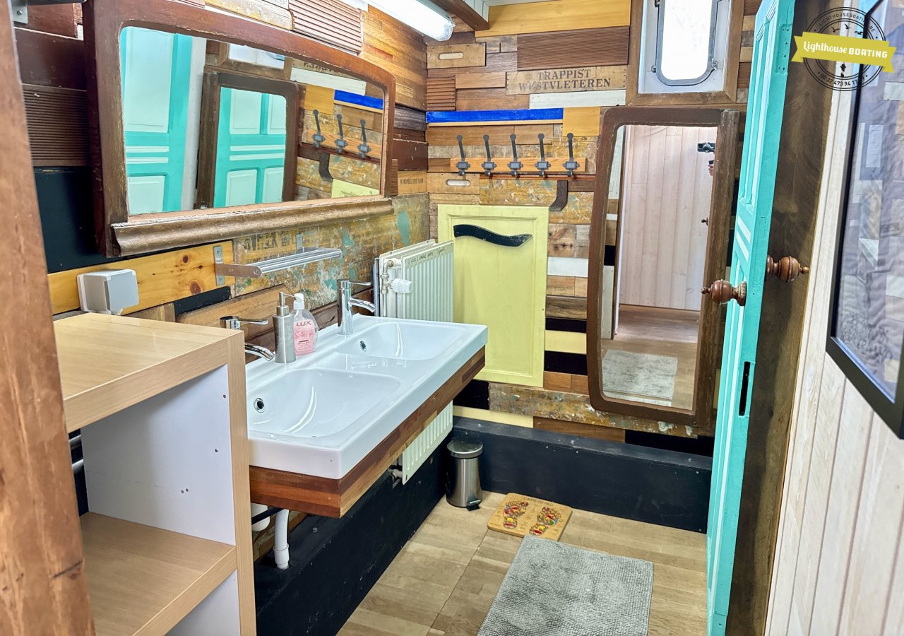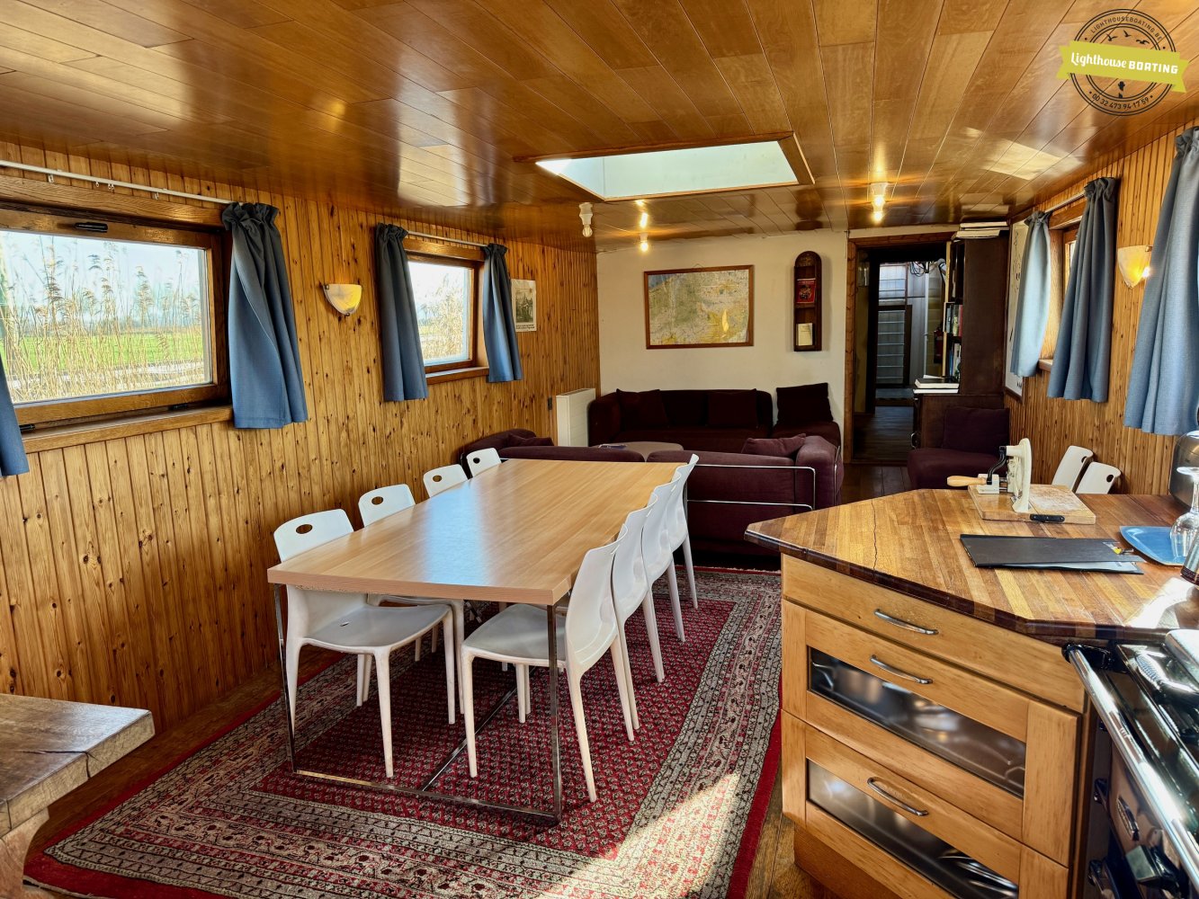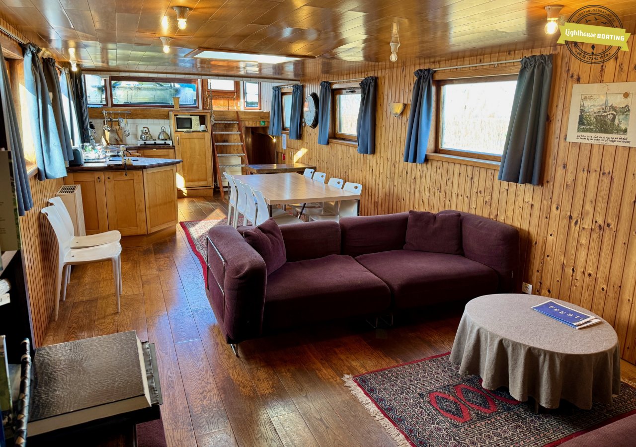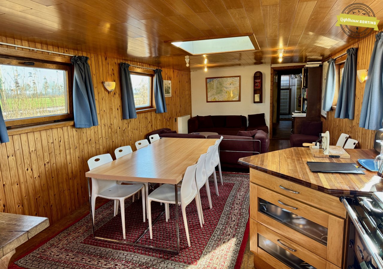 The St-Antoine is an unusual houseboat with a distinctly nautical character. Originally a cargo ship from 1929, it has been converted into an atmospheric accommodation for nine people. The exterior - with its pointed, characteristic ‘ tip’ reminiscent of the robust lines of the original - bears witness to its rich maritime history, while the interior offers a pleasant mix of authentic elements and contemporary comfort.