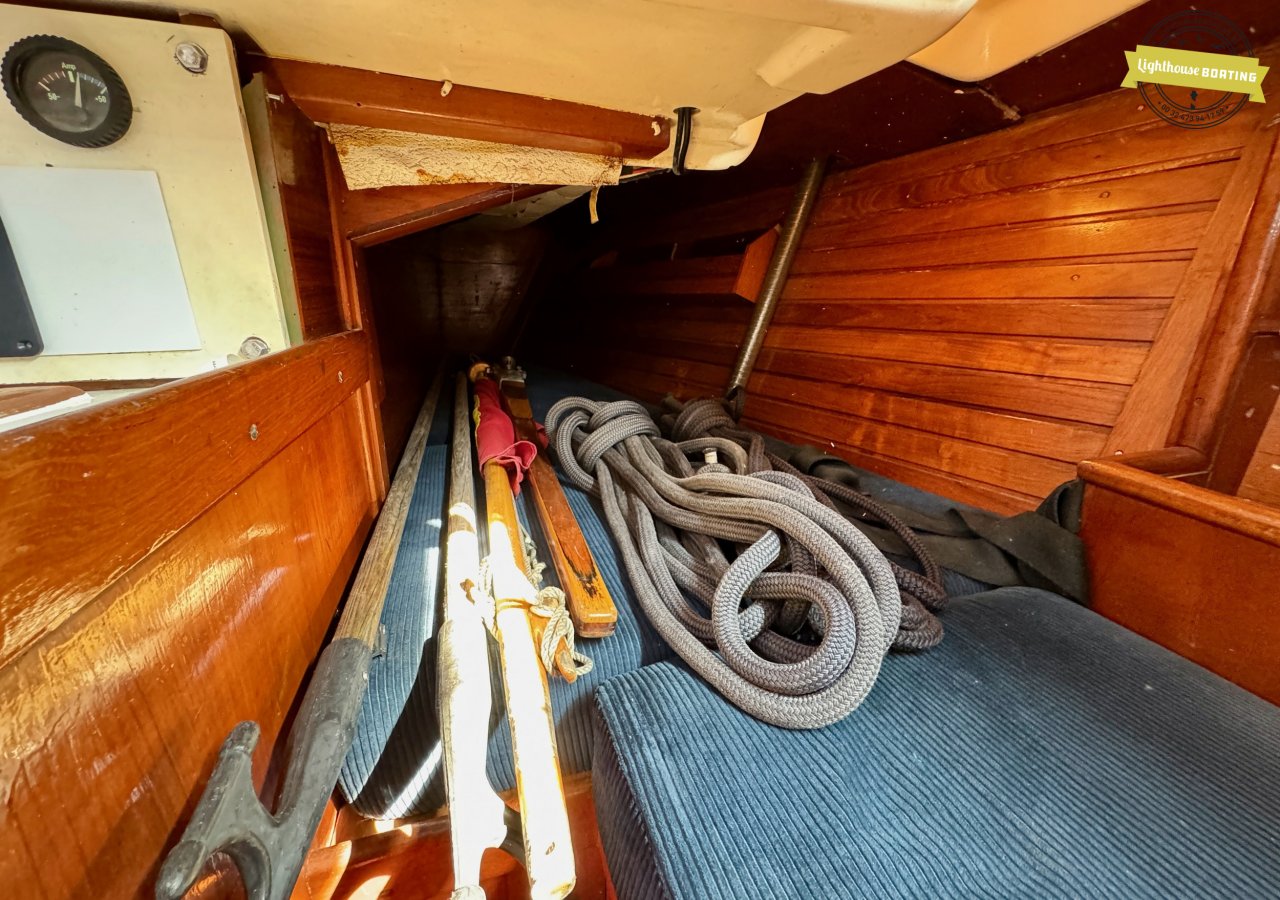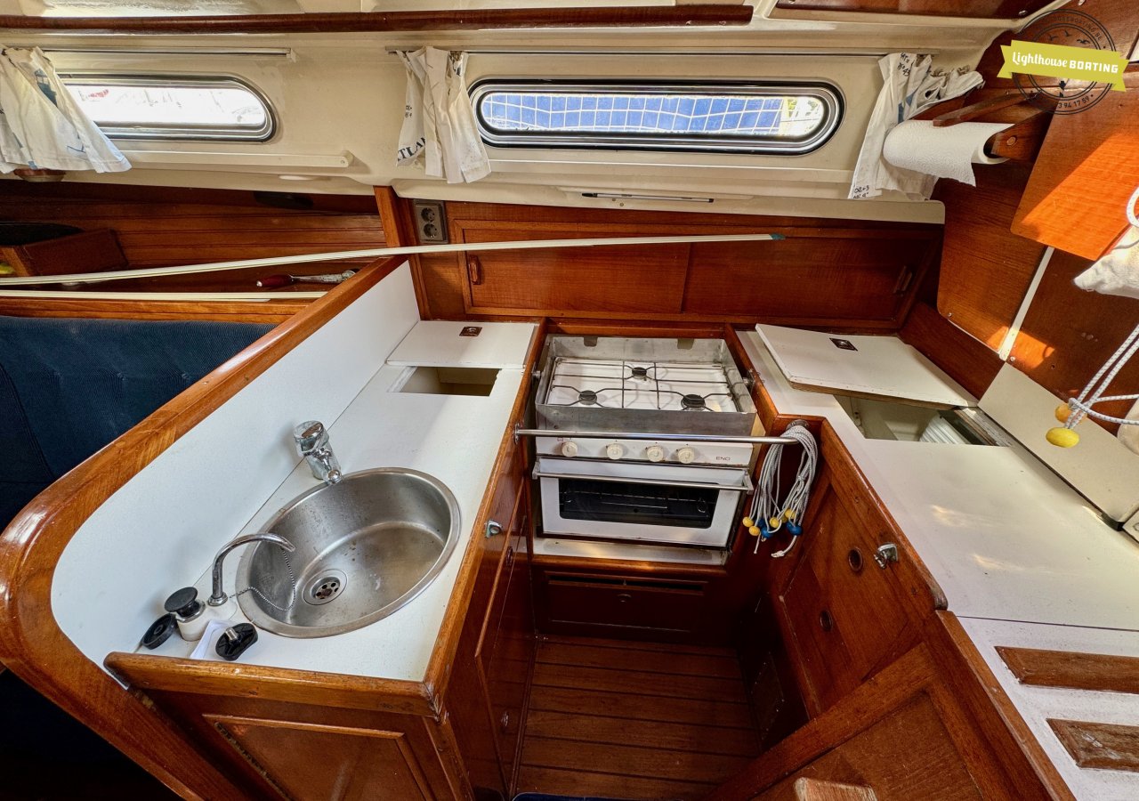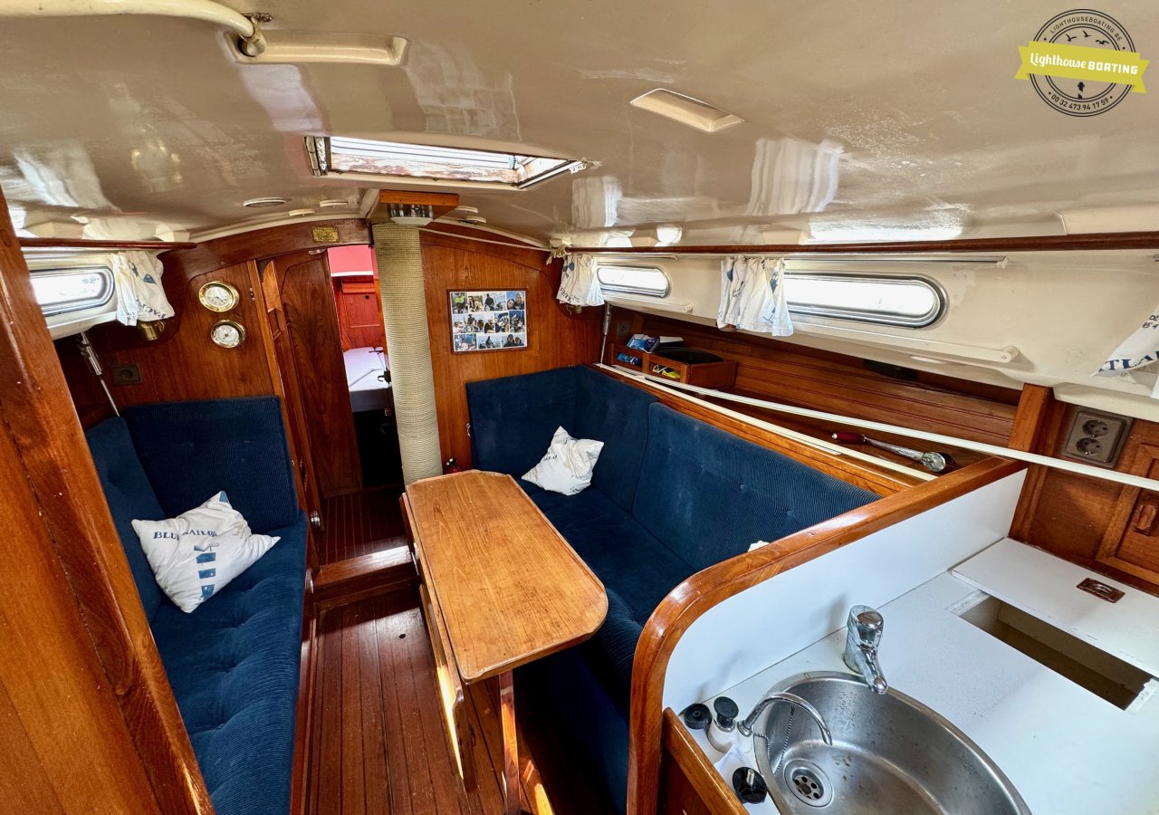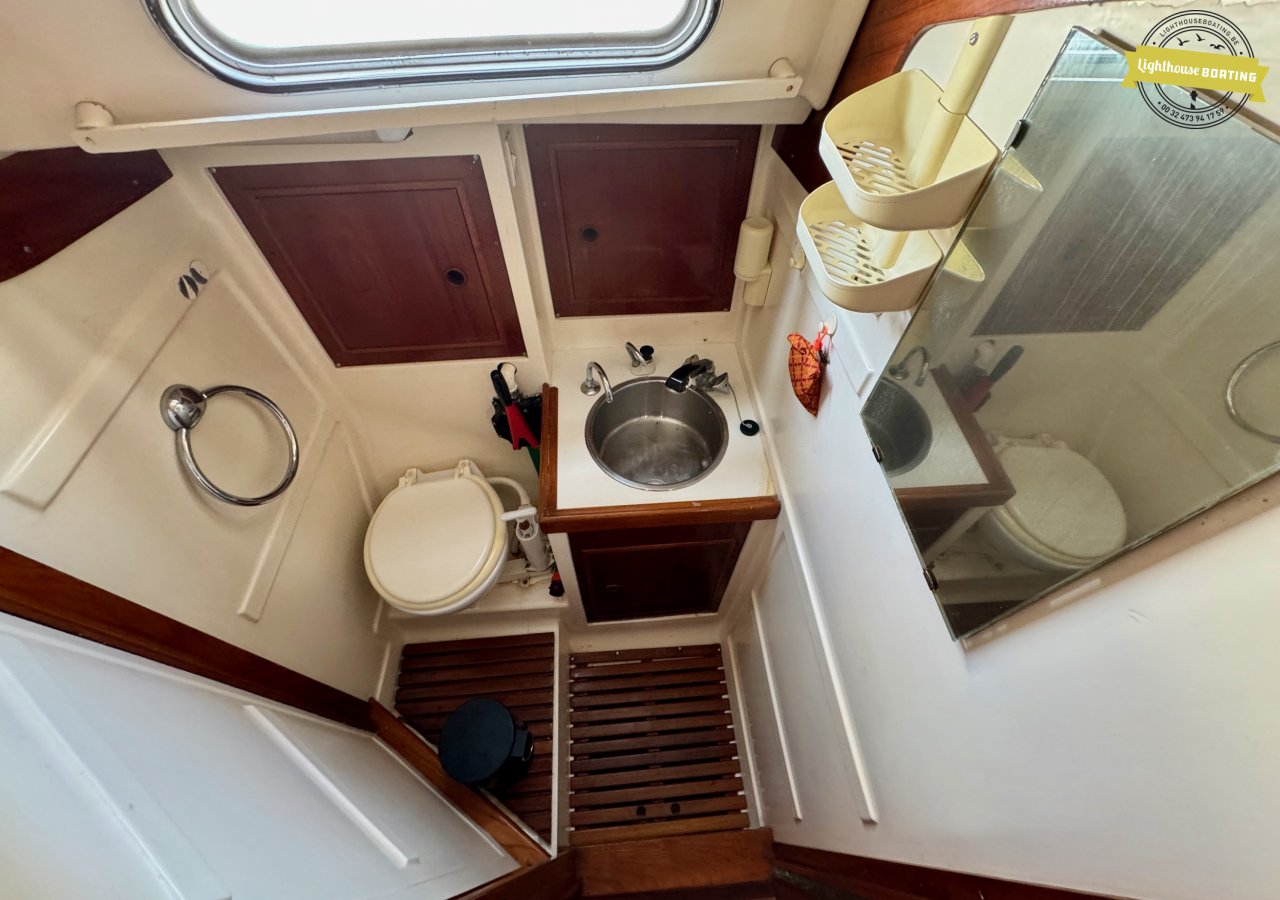 The interior exudes classic warmth, finished with extensive use of solid wood. Forward, there is a spacious V-berth. The cozy saloon offers comfortable seating, and just aft of the navigation table on port side, there is an additional single berth — perfect for night watches or accommodating extra guests. On starboard side, a practical L-shaped galley is fitted with double sinks and a gas stove. The toilet compartment is located on the port side and is generously sized.