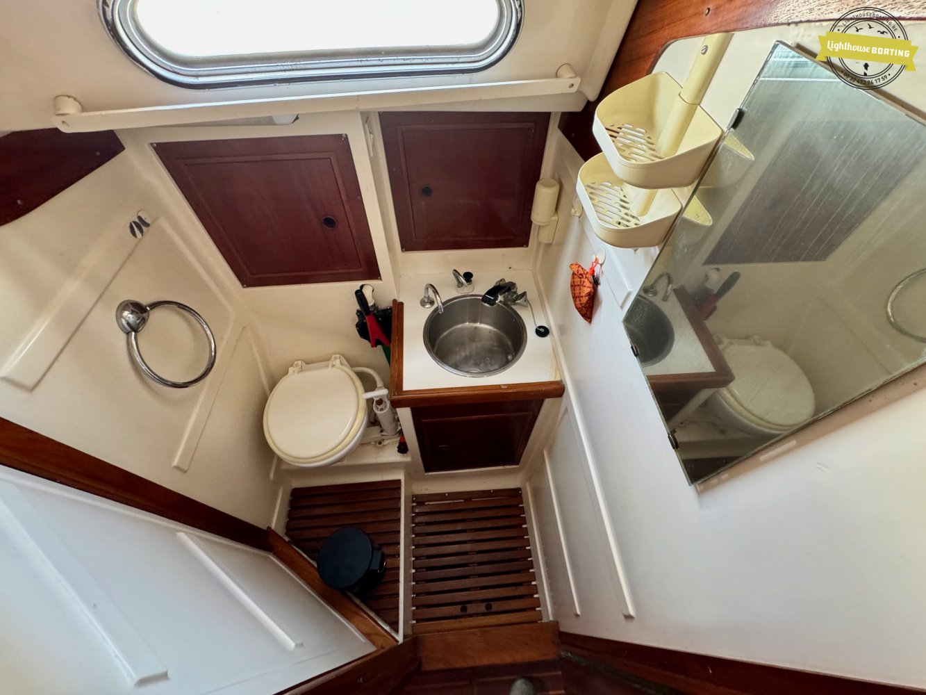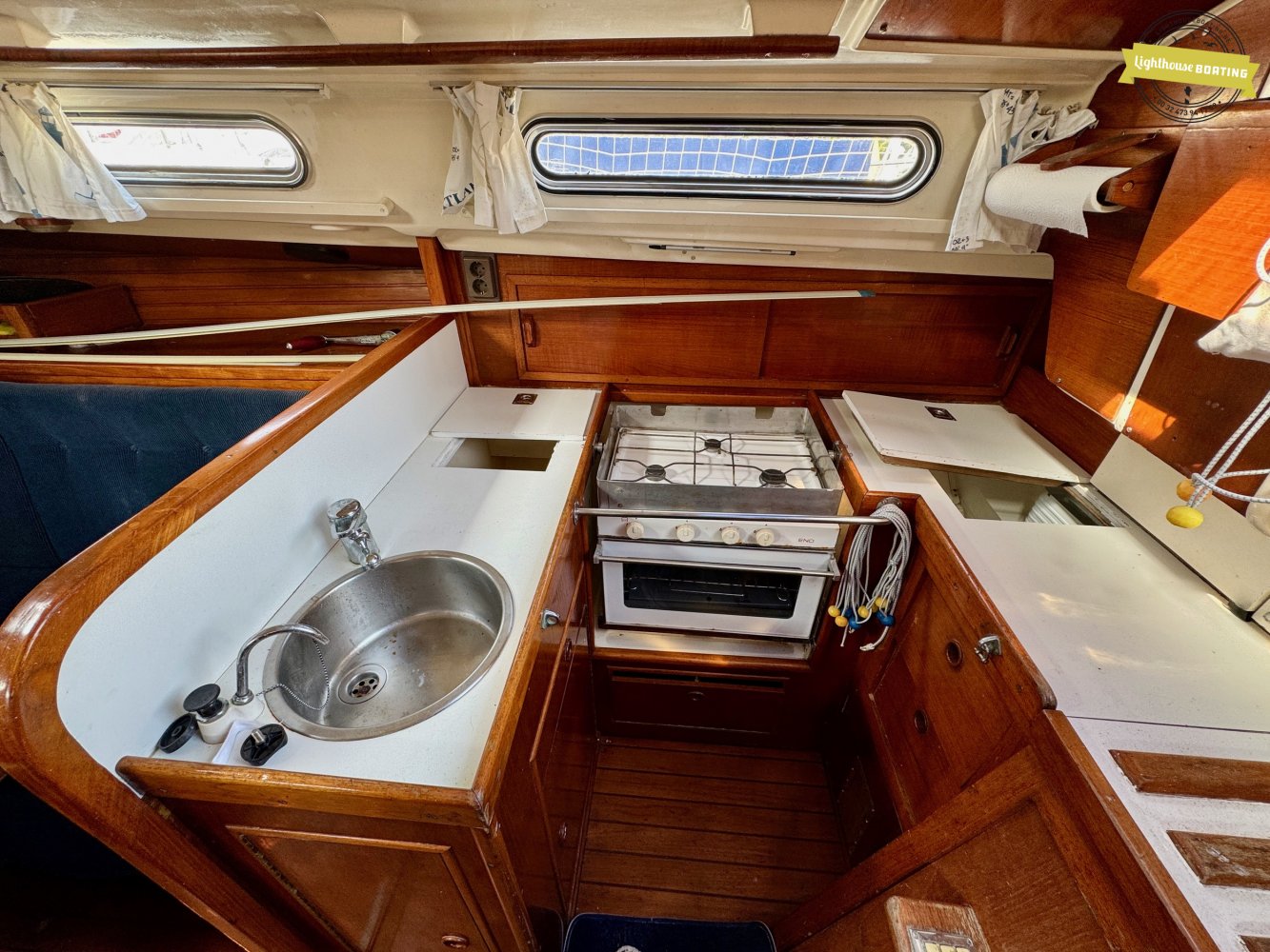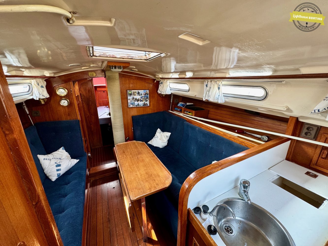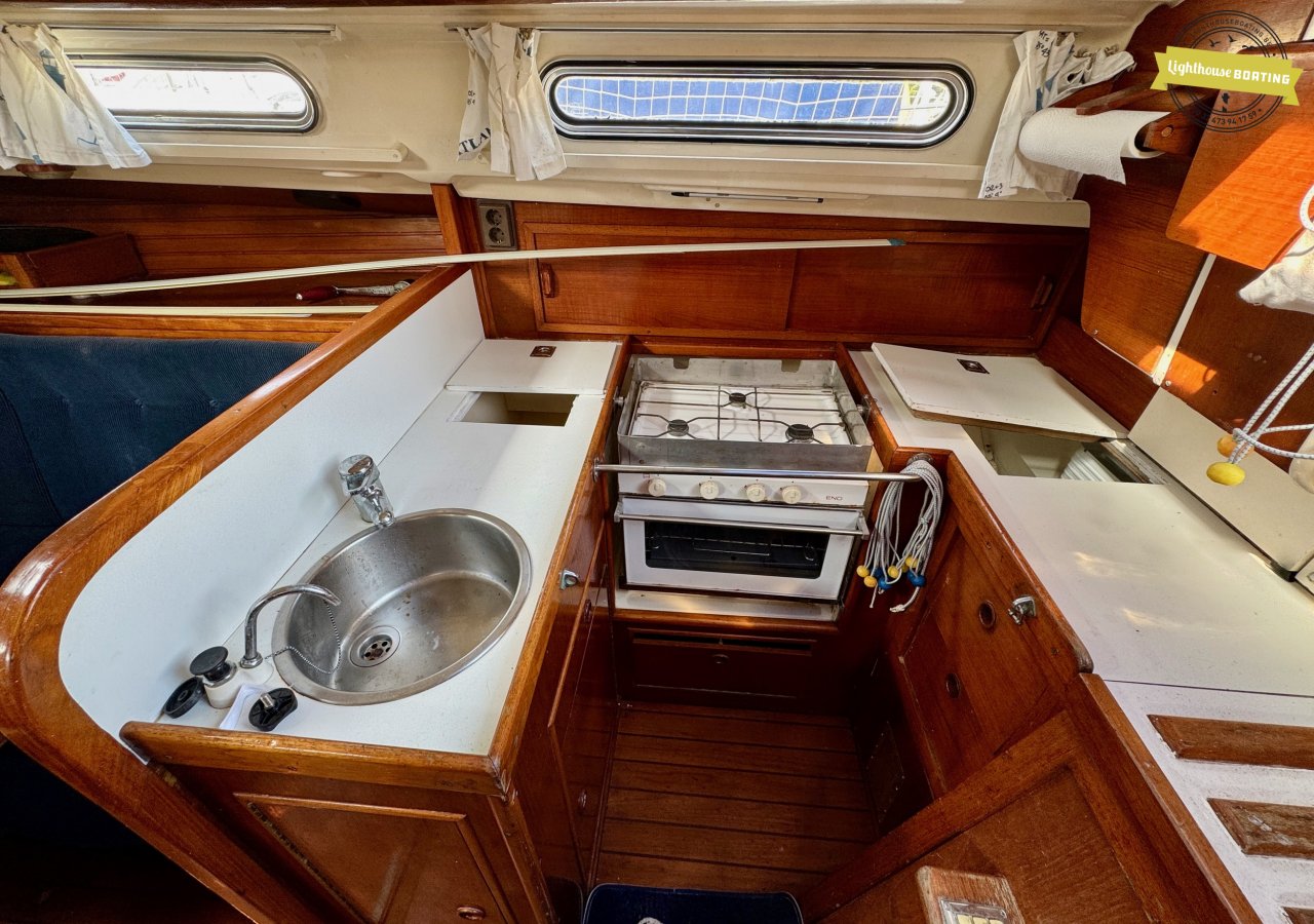 The interior exudes classic warmth, finished with extensive use of solid wood. Forward, there is a spacious V-berth. The cozy saloon offers comfortable seating, and just aft of the navigation table on port side, there is an additional single berth — perfect for night watches or accommodating extra guests. On starboard side, a practical L-shaped galley is fitted with double sinks and a gas stove. The toilet compartment is located on the port side and is generously sized.