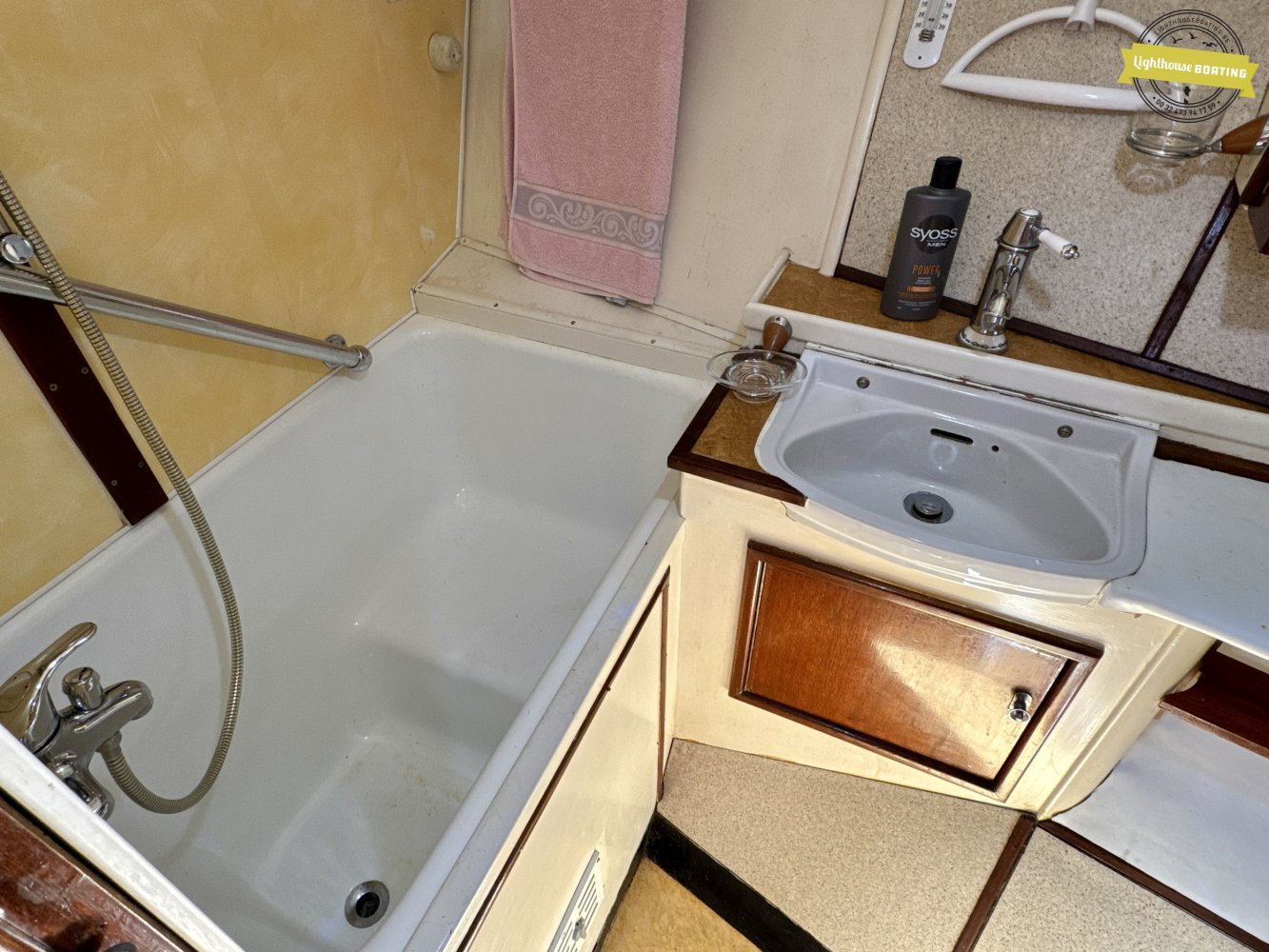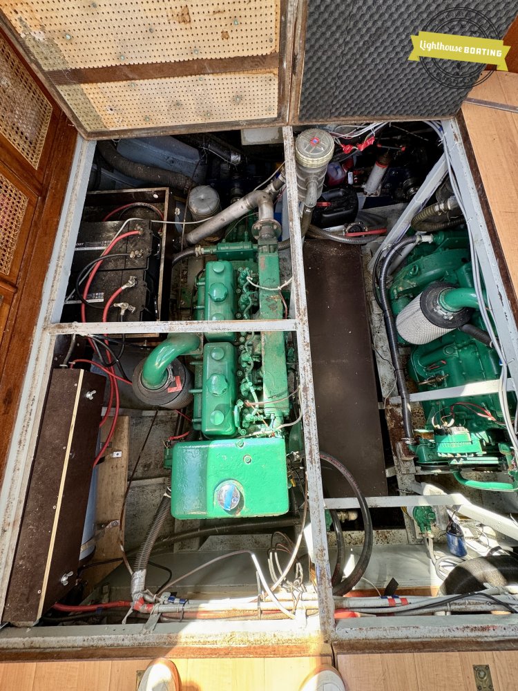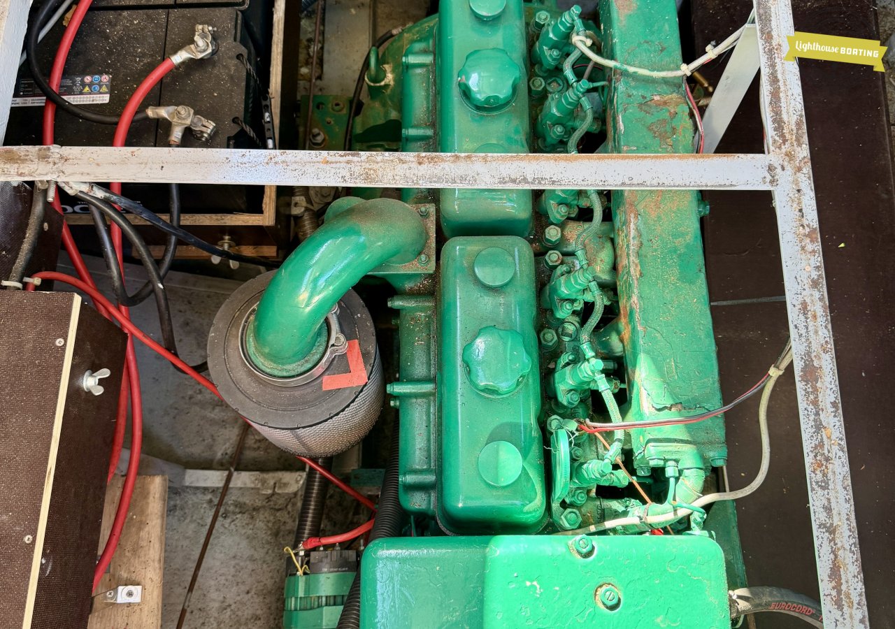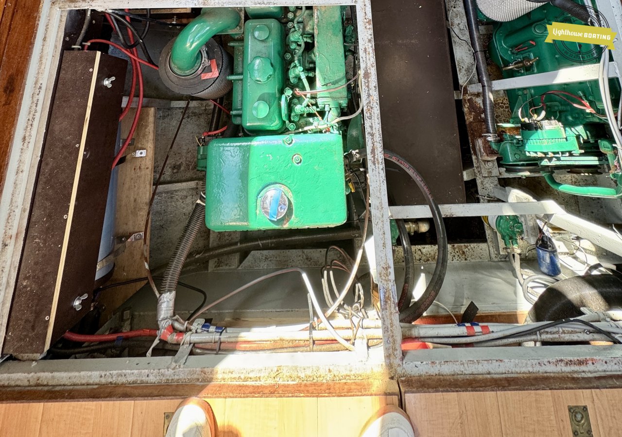 A good example of a professional build that was later re-purposed for leisure with a 2x 220HP engines and a very seaworthy flared bow, this vessel is now powered by two overhauled original Volvo Penta MD47 engines (from 1962, 2x 85 hp, 400 engine hours after overhaul in 2012), she is both powerful and economical with a fuel consumption of 5 liters/hour per engine. An electric bow thruster (Vetus 12V) makes maneuvering a breeze.