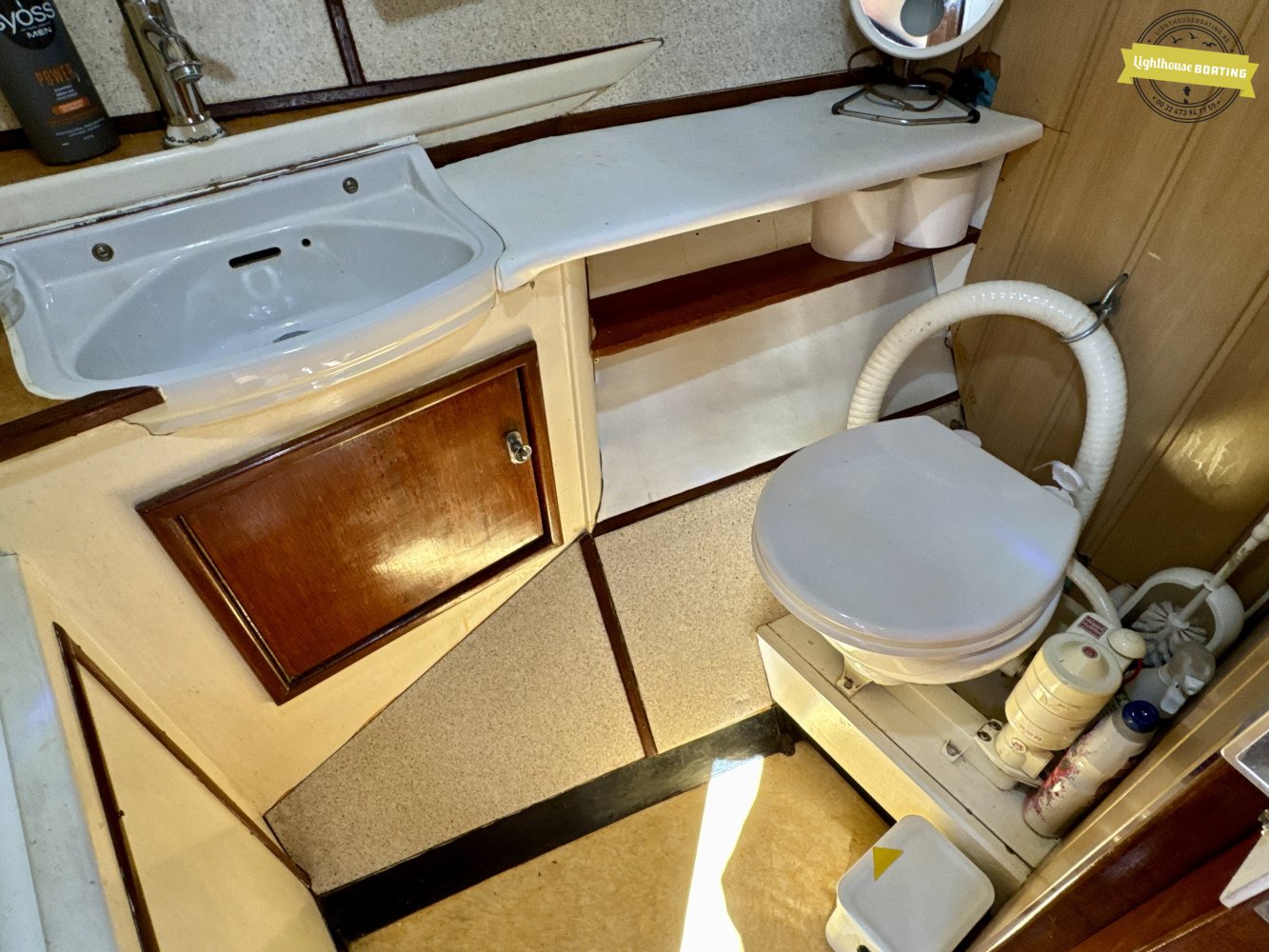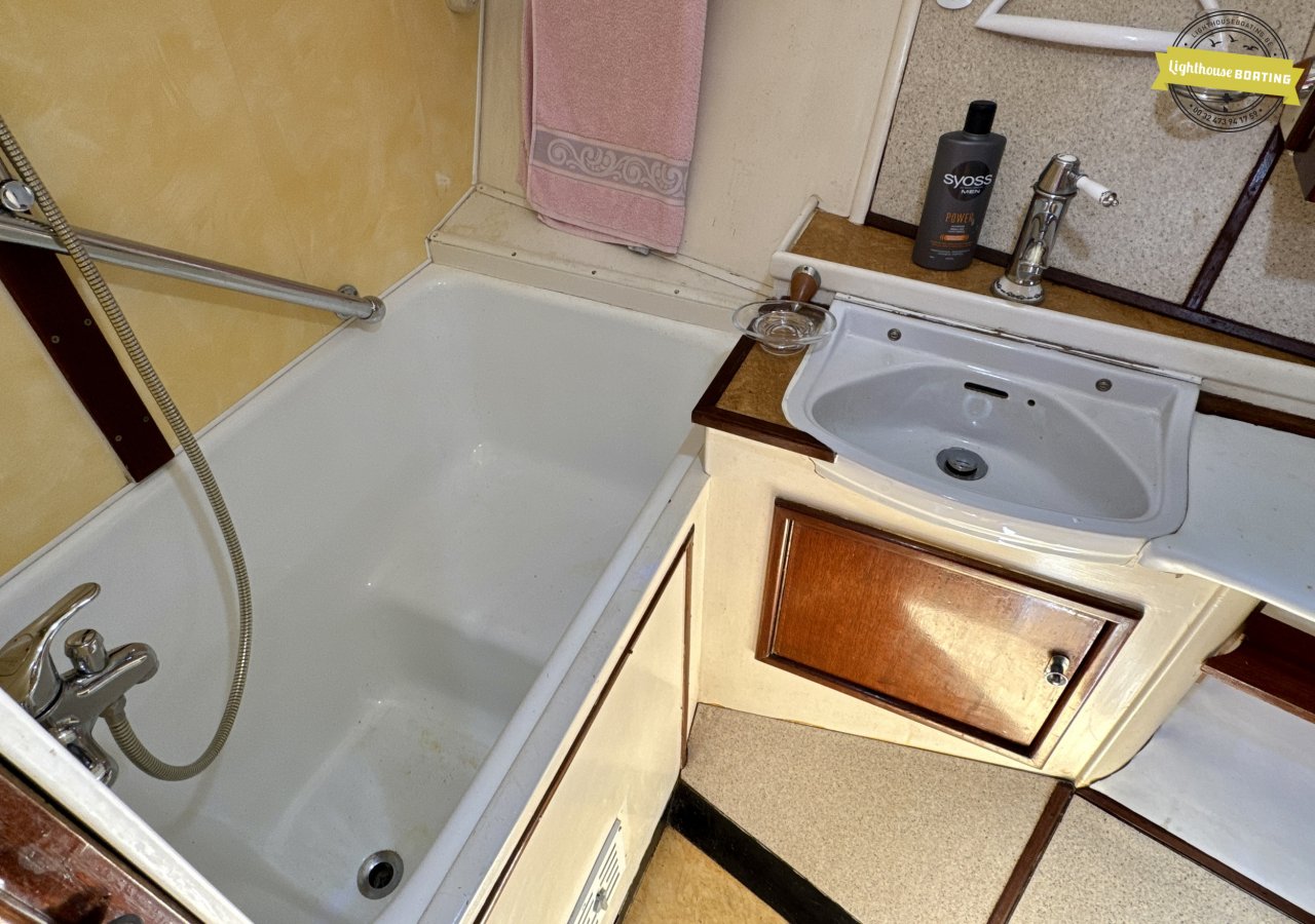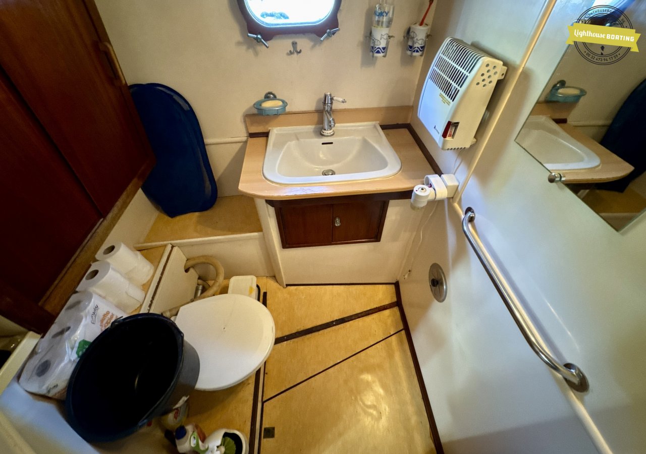 A good example of a professional build that was later re-purposed for leisure with a 2x 220HP engines and a very seaworthy flared bow, this vessel is now powered by two overhauled original Volvo Penta MD47 engines (from 1962, 2x 85 hp, 400 engine hours after overhaul in 2012), she is both powerful and economical with a fuel consumption of 5 liters/hour per engine. An electric bow thruster (Vetus 12V) makes maneuvering a breeze.
