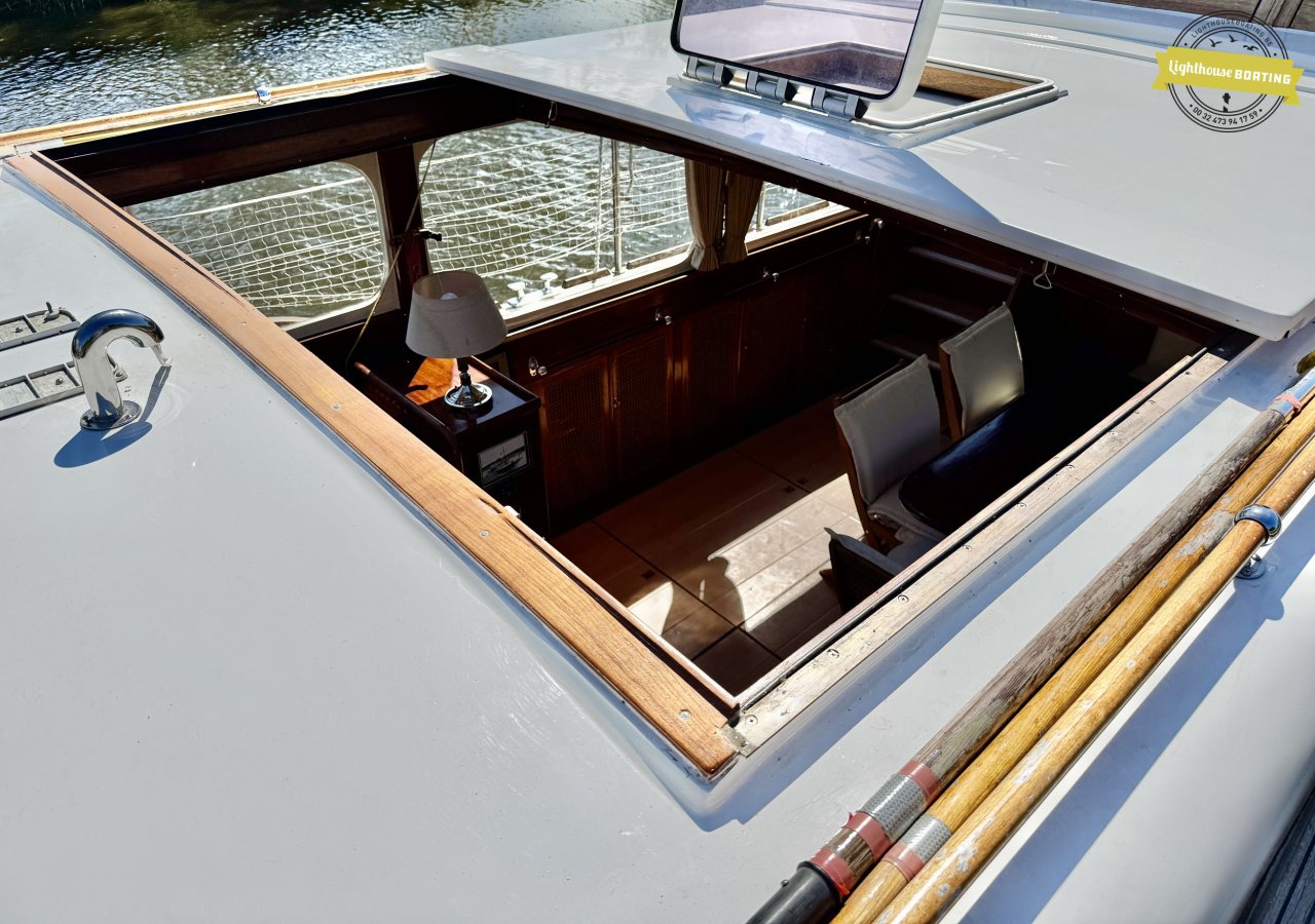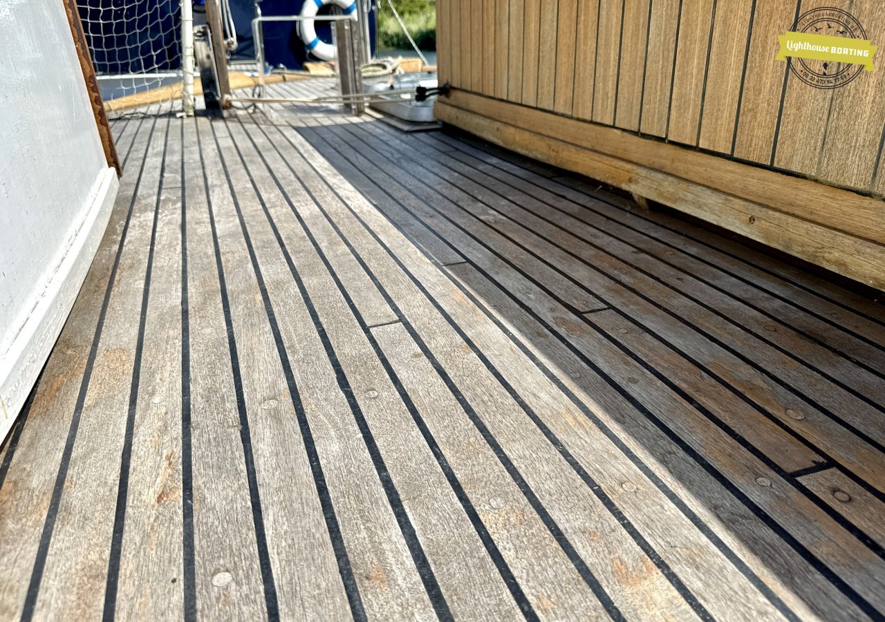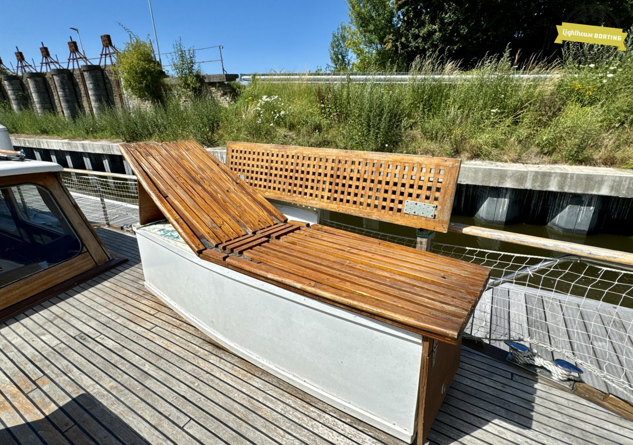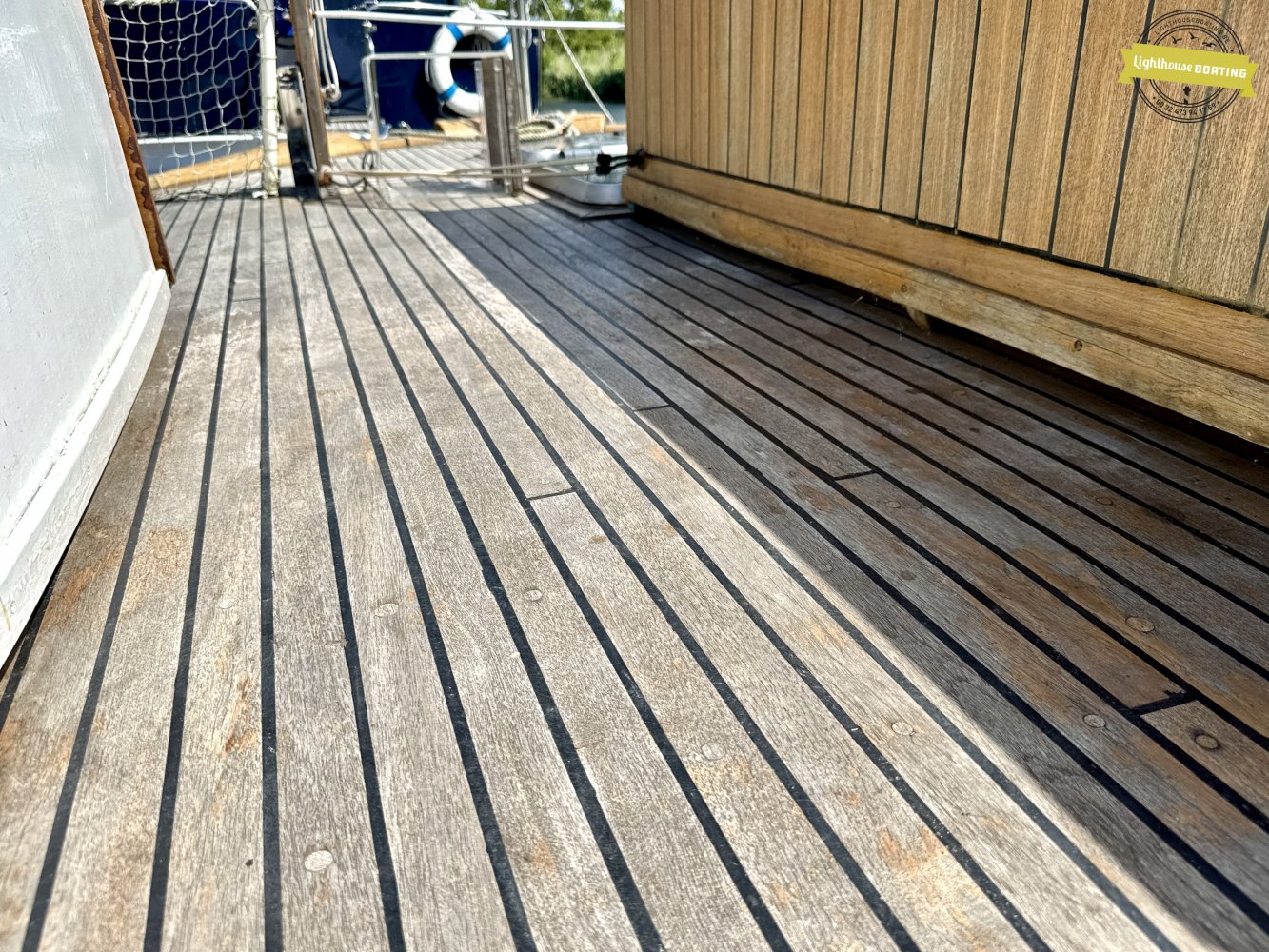 A completely renewed teak deck (2017-2018). The old deck was removed, and a new 5mm steel plate was welded underneath (treated with 3 layers of epoxy paint), followed by new marine-quality plywood and new teak.