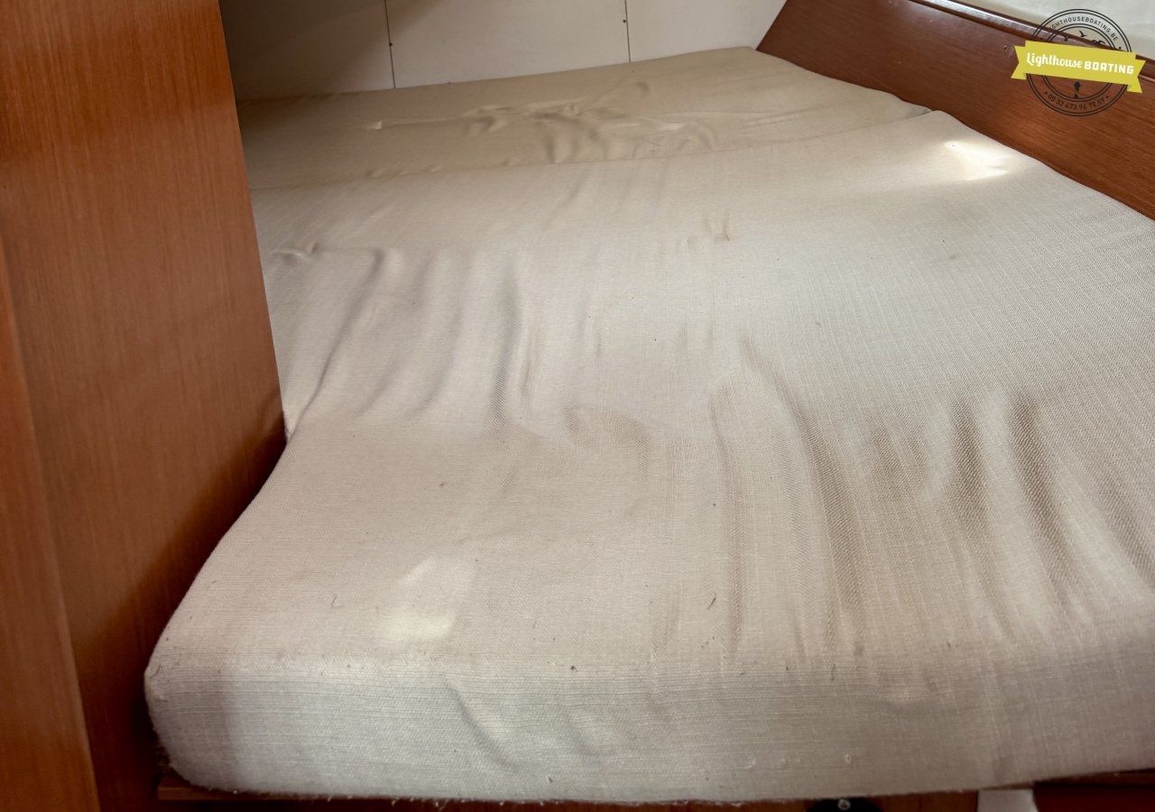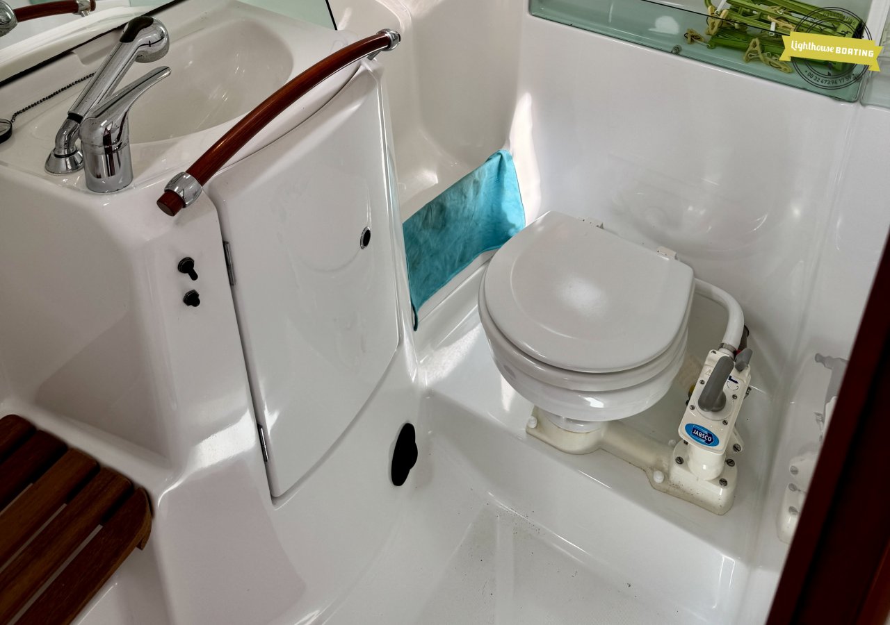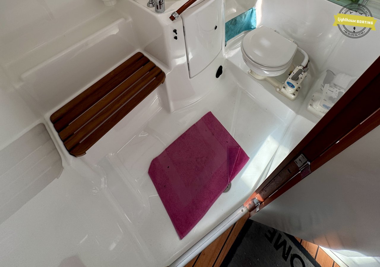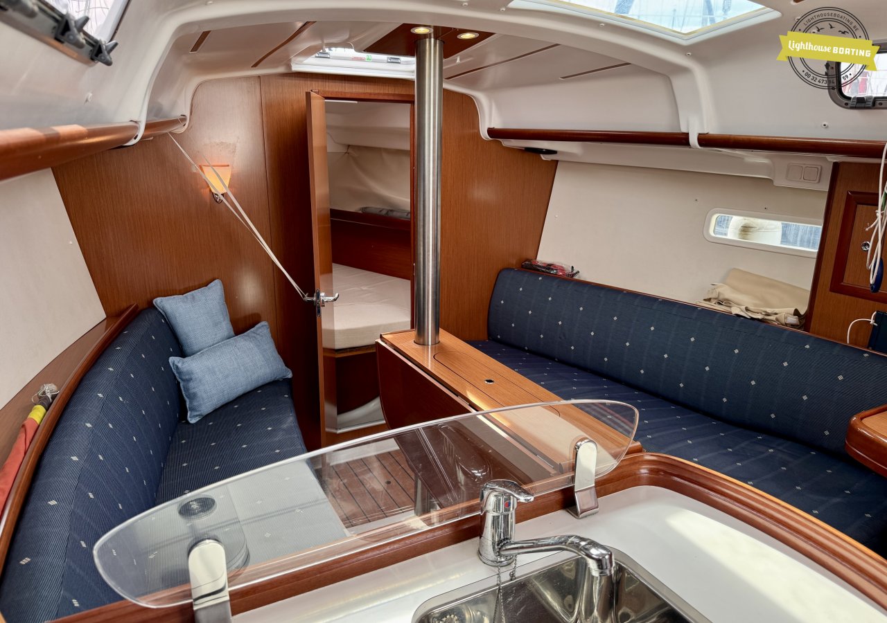 With a length of 10.00 m, a beam of 3.26 m, and a draft of 1.80 m, the boat offers a very comfortable living environment. The generous headroom of 195 cm and the efficient layout with two cabins provide sleeping berths for six people. The interior, with its modern wood look, is light and welcoming. The spacious galley and large bathroom add to the comfort on board.