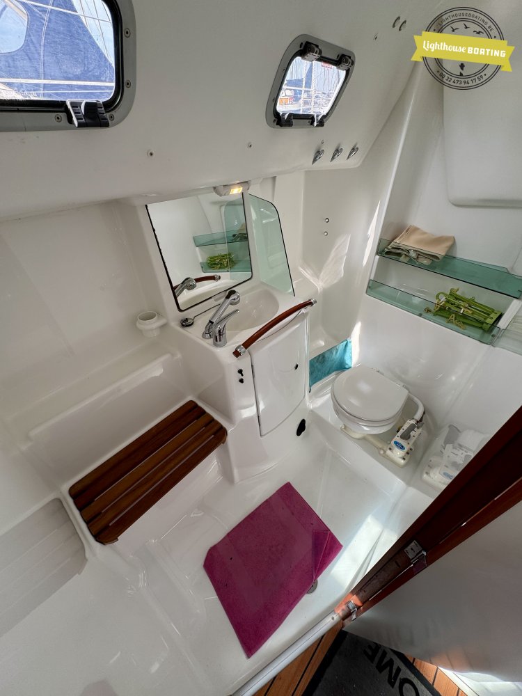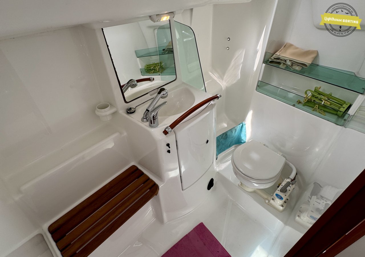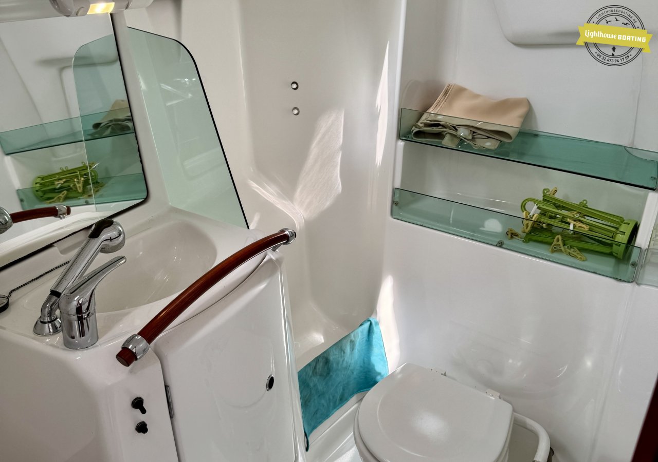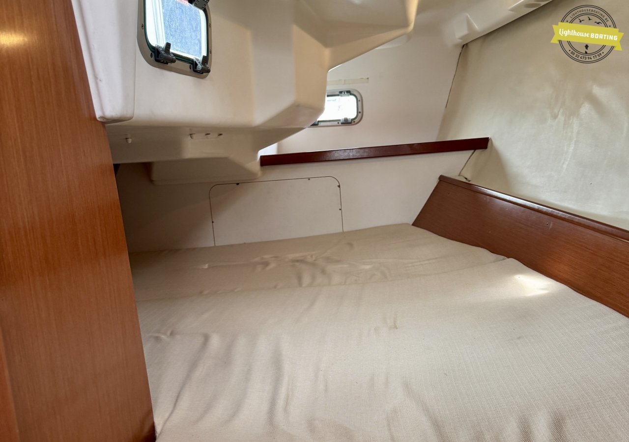 With a length of 10.00 m, a beam of 3.26 m, and a draft of 1.80 m, the boat offers a very comfortable living environment. The generous headroom of 195 cm and the efficient layout with two cabins provide sleeping berths for six people. The interior, with its modern wood look, is light and welcoming. The spacious galley and large bathroom add to the comfort on board.