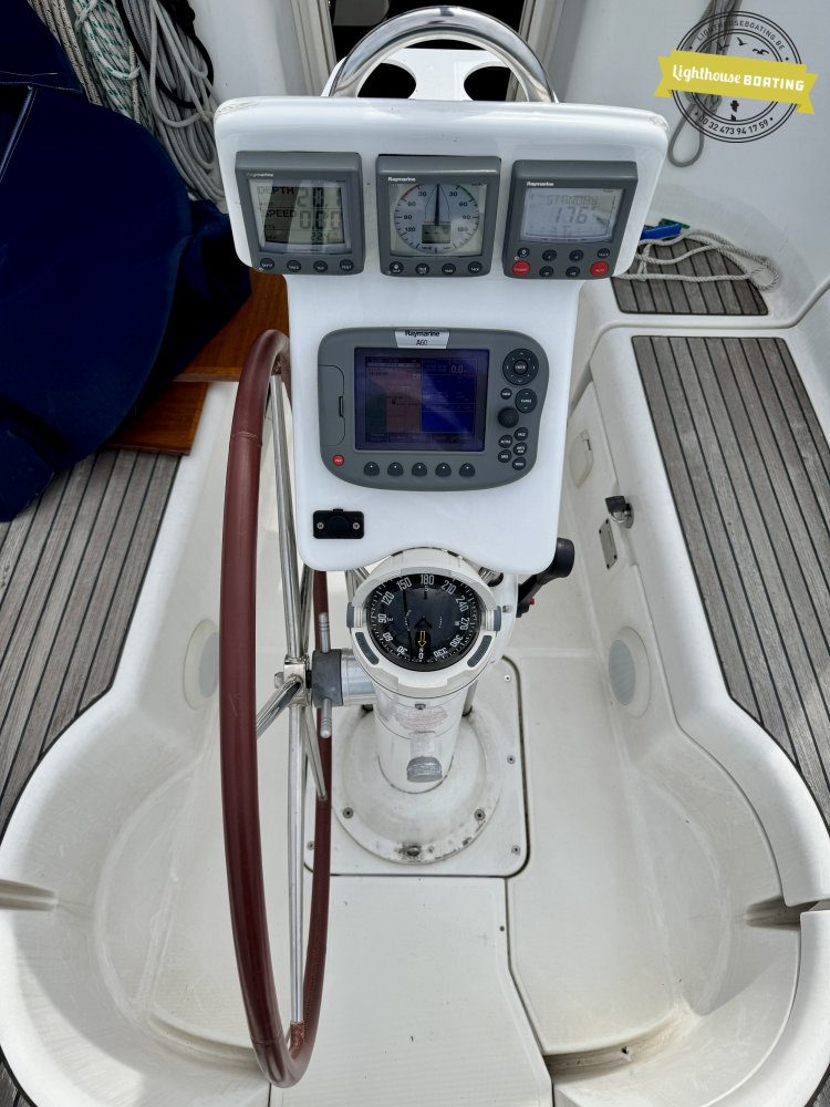 The boat, currently located at VYNieuwpoort Harbour, is equipped with navigation equipment including a Raymarine A60 chartplotter, ST6002 autopilot, and ST60 Wind instruments. An electric anchor windlass, spray hood, and a spacious cockpit table complete the picture.