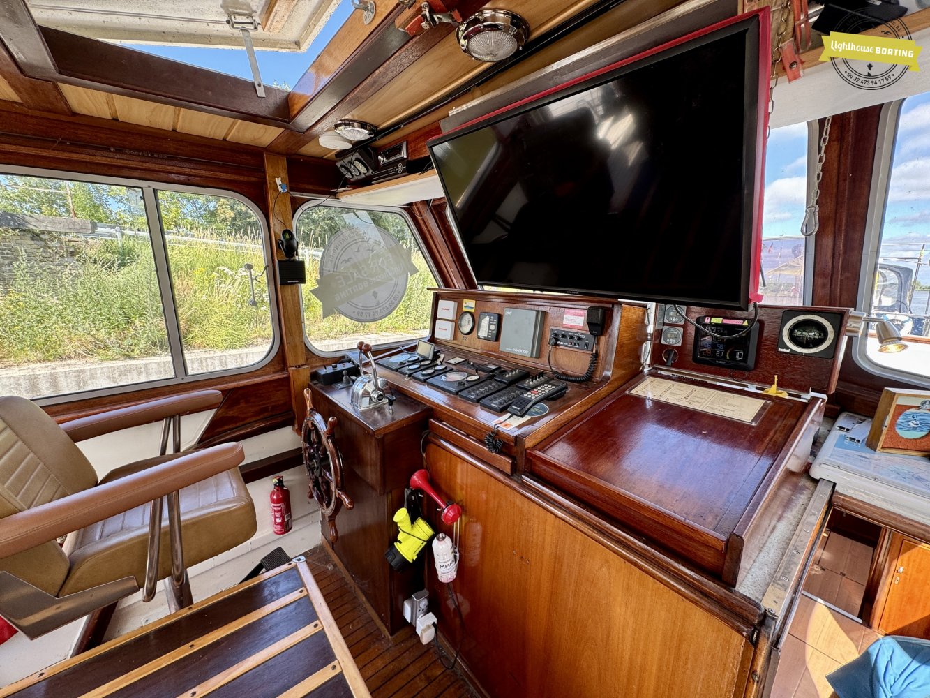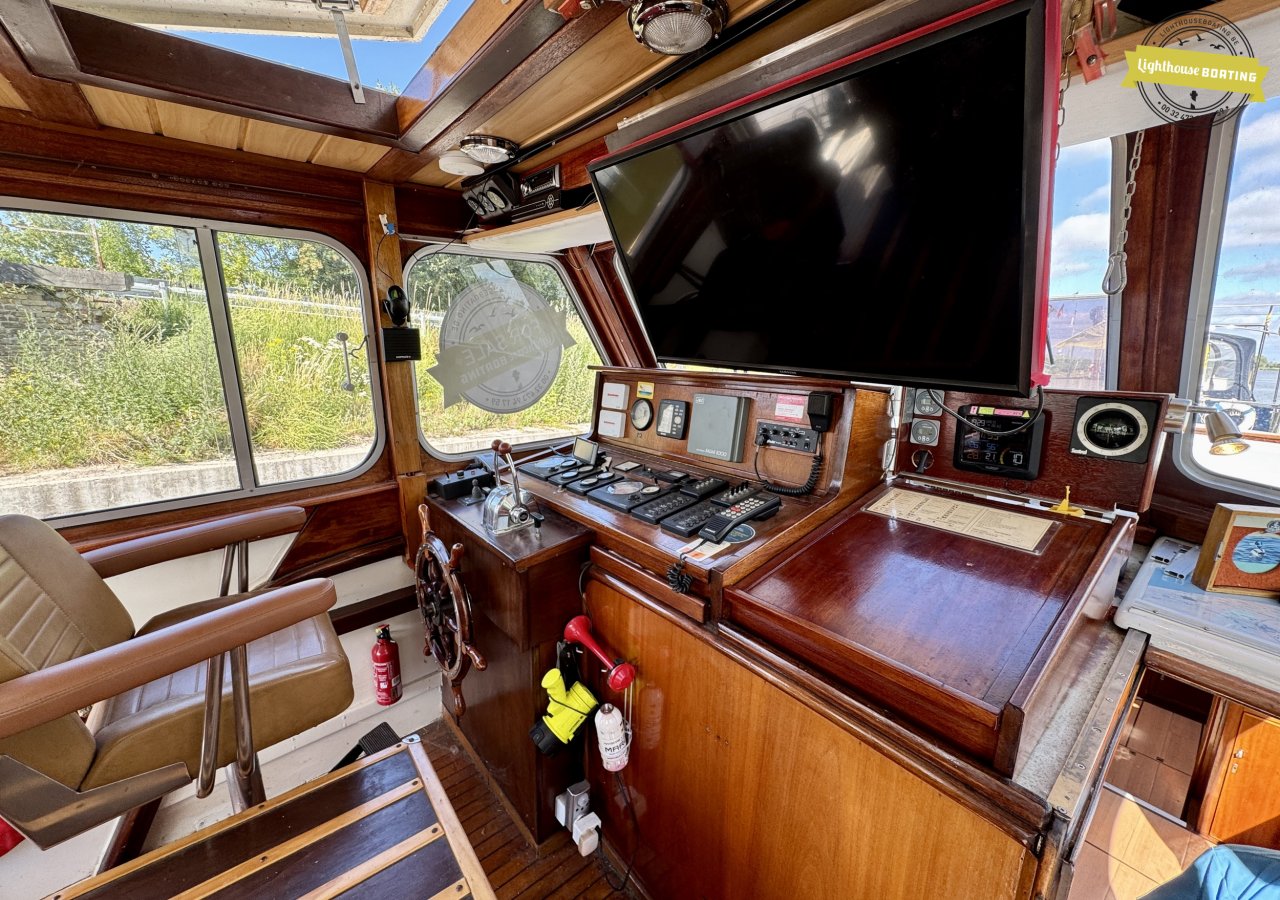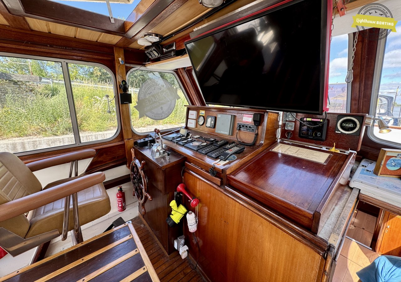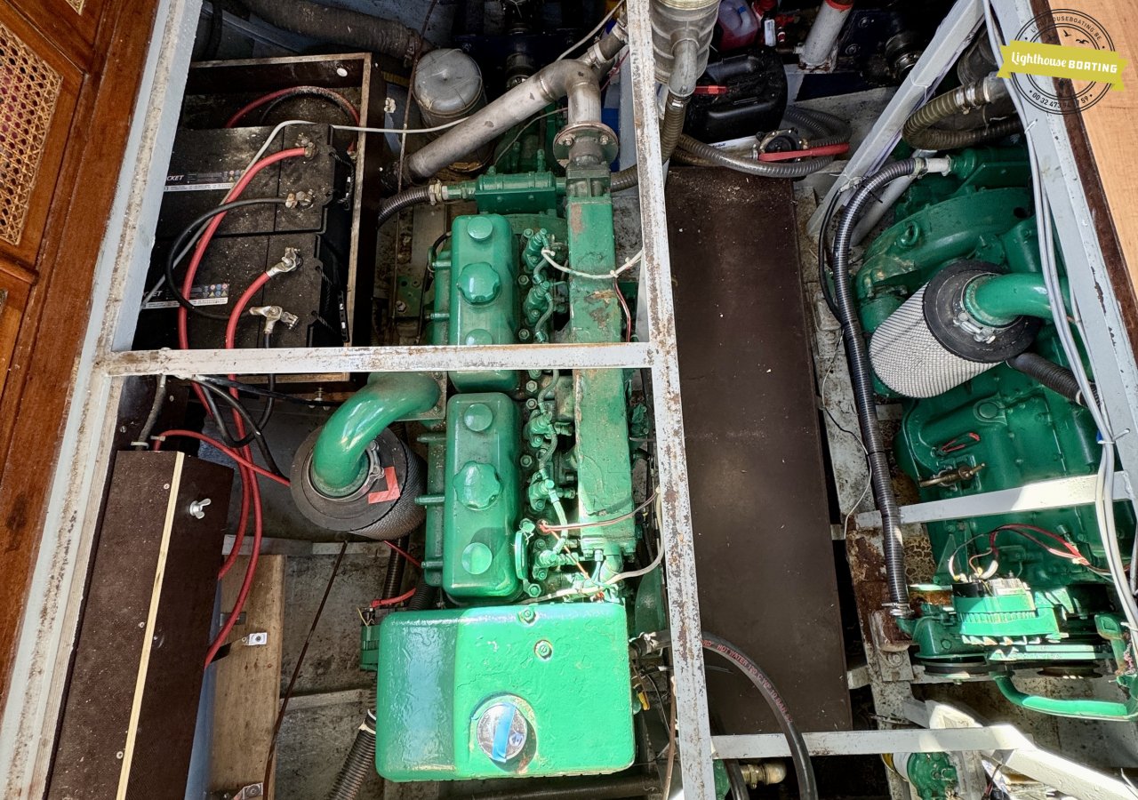 A good example of a professional build that was later re-purposed for leisure with a 2x 220HP engines and a very seaworthy flared bow, this vessel is now powered by two overhauled original Volvo Penta MD47 engines (from 1962, 2x 85 hp, 400 engine hours after overhaul in 2012), she is both powerful and economical with a fuel consumption of 5 liters/hour per engine. An electric bow thruster (Vetus 12V) makes maneuvering a breeze.