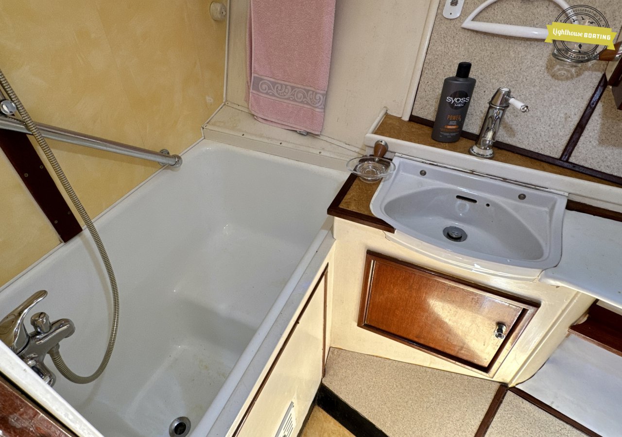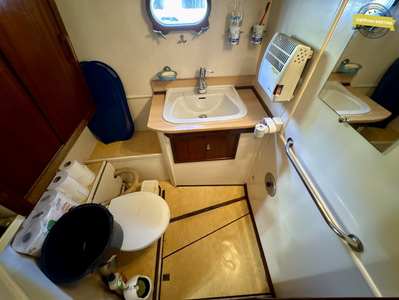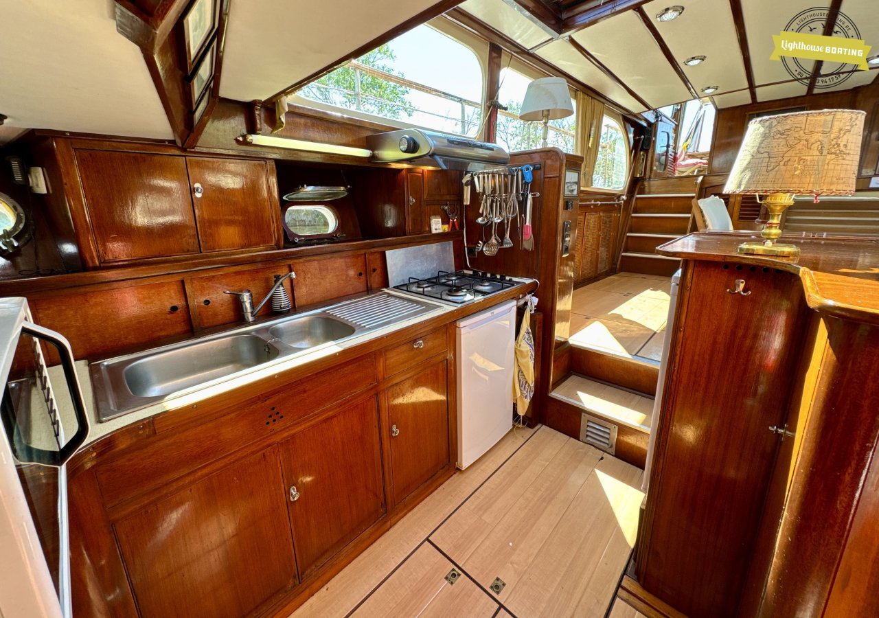 A good example of a professional build that was later re-purposed for leisure with a 2x 220HP engines and a very seaworthy flared bow, this vessel is now powered by two overhauled original Volvo Penta MD47 engines (from 1962, 2x 85 hp, 400 engine hours after overhaul in 2012), she is both powerful and economical with a fuel consumption of 5 liters/hour per engine. An electric bow thruster (Vetus 12V) makes maneuvering a breeze.