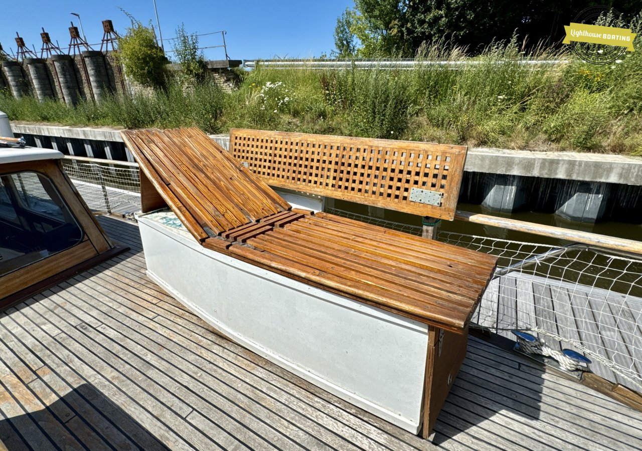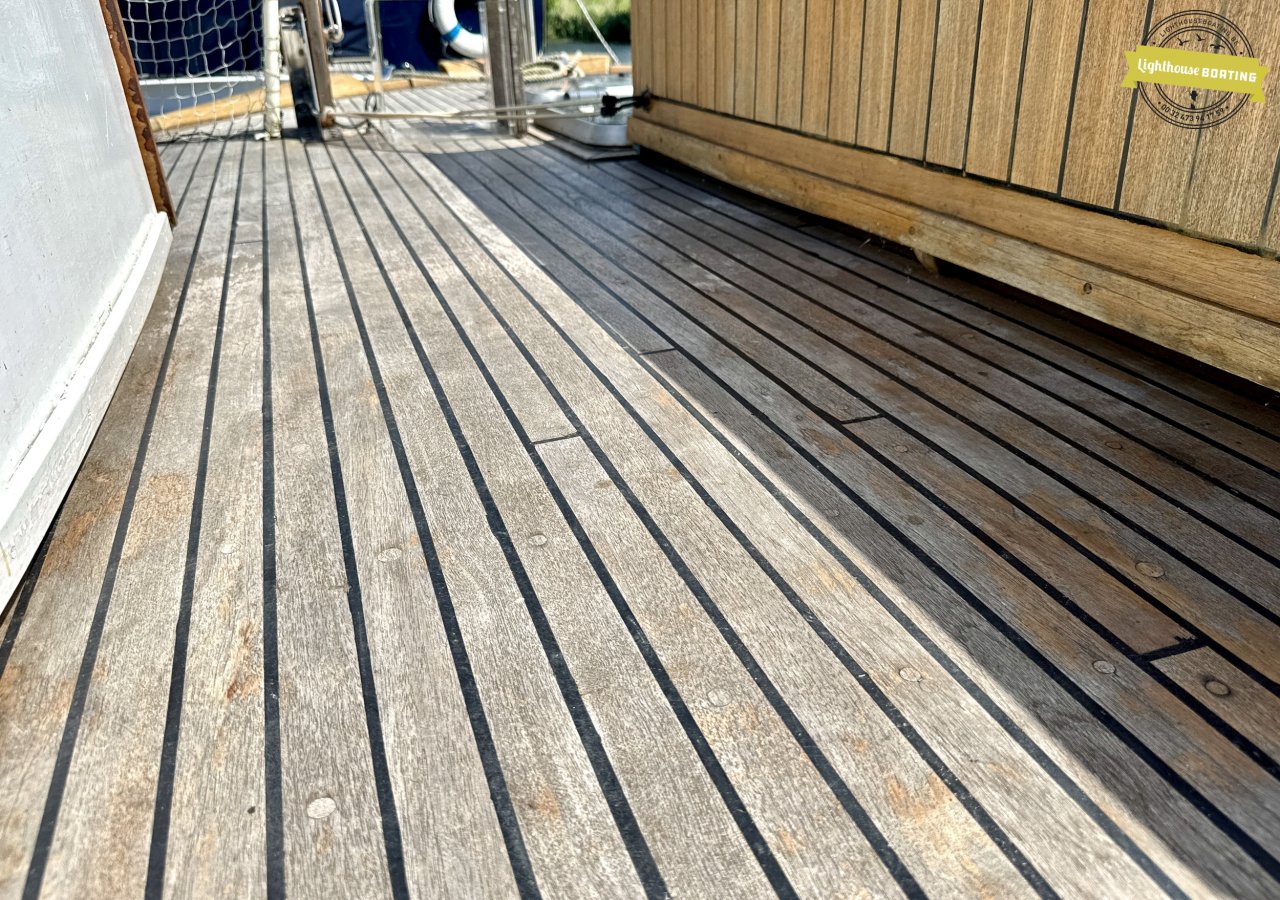 A completely renewed teak deck (2017-2018). The old deck was removed, and a new 5mm steel plate was welded underneath (treated with 3 layers of epoxy paint), followed by new marine-quality plywood and new teak.