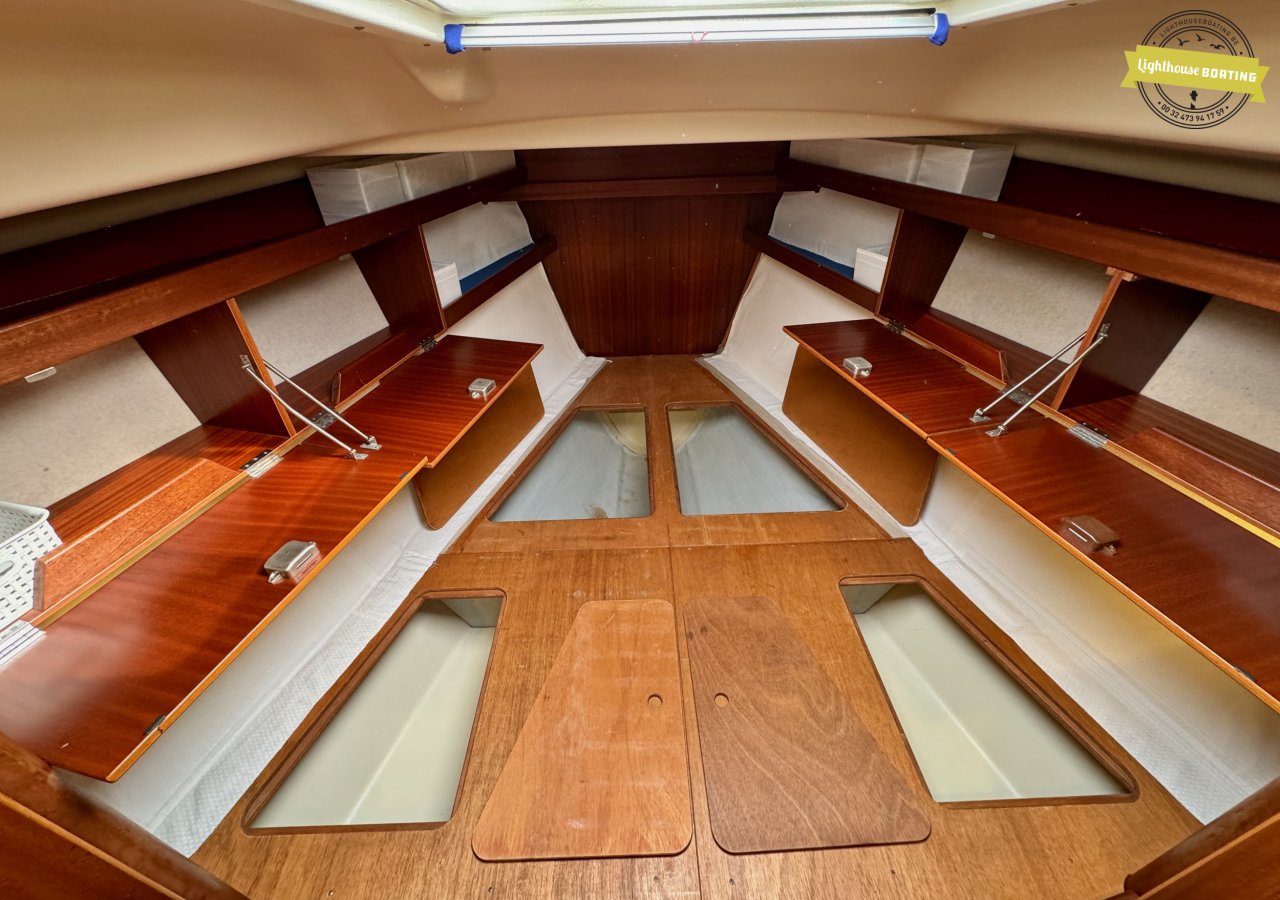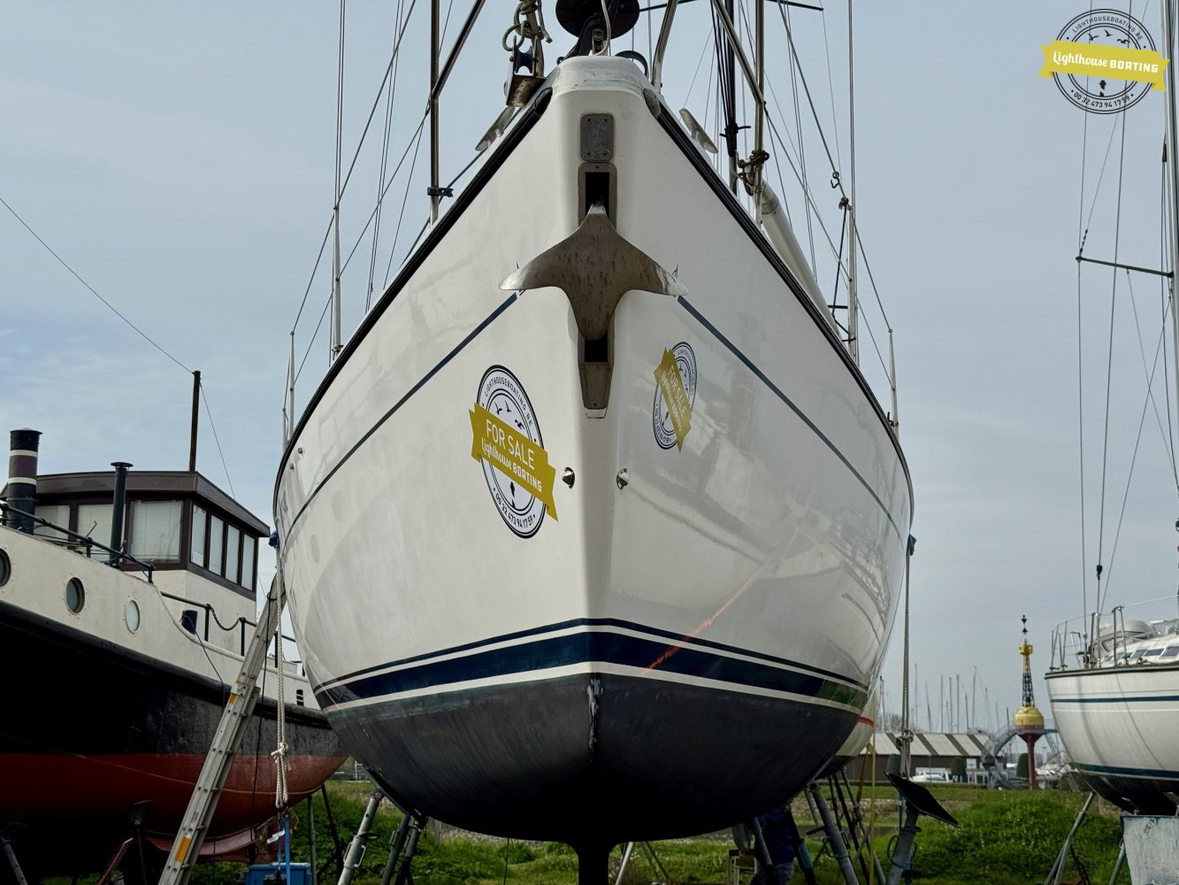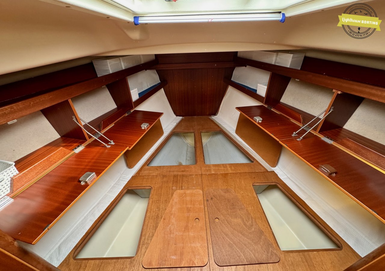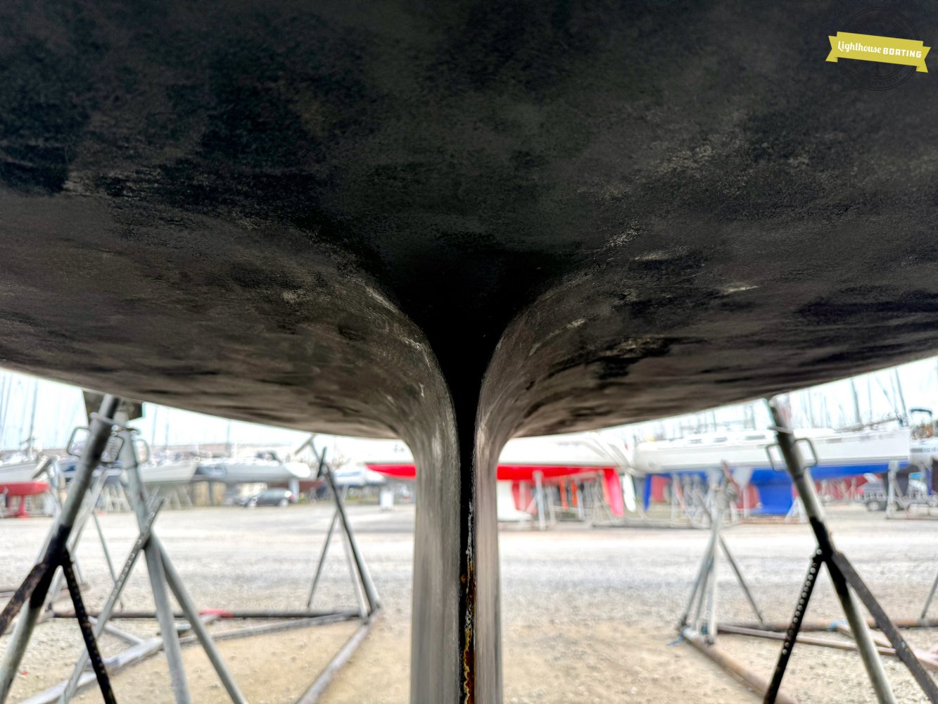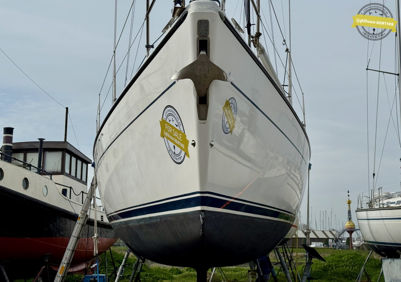 Hull and Construction: The hull is a white round-bilge GRP (polyester) construction. Notably, the hull was stripped and re-treated with epoxy in 2021. It features a fixed lead keel with a draught of 1.95 meters.