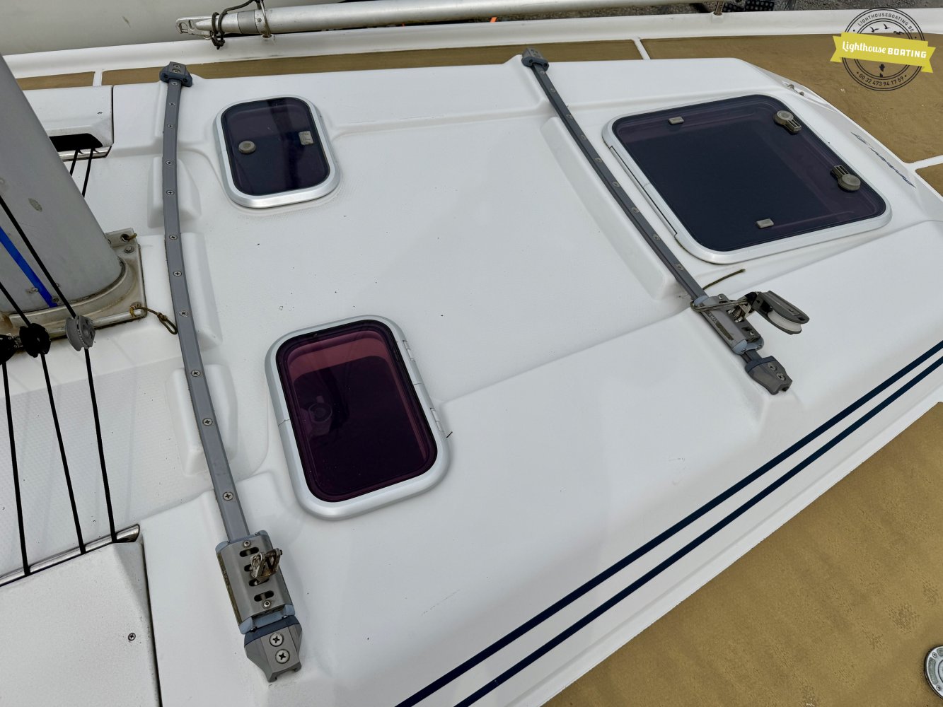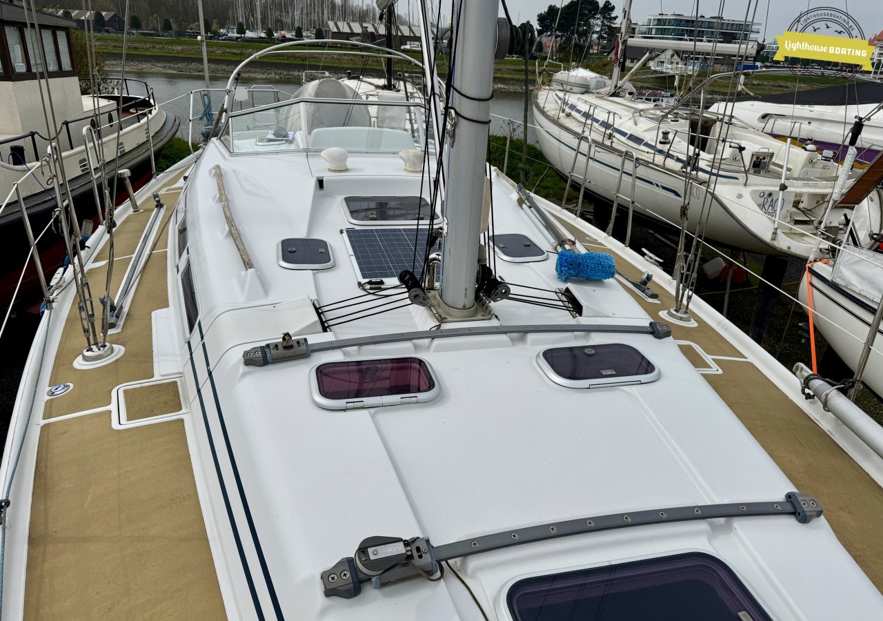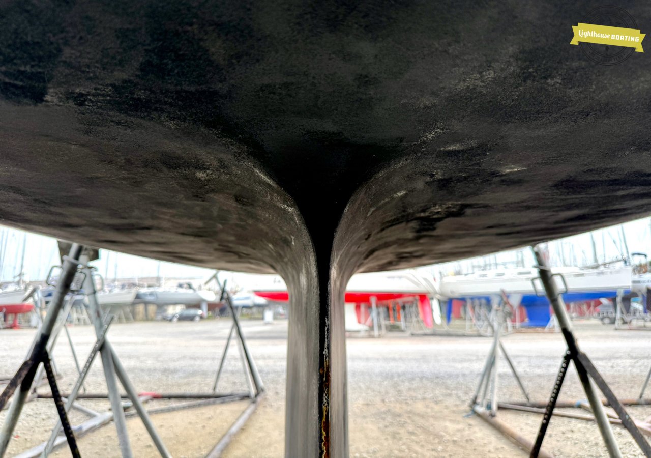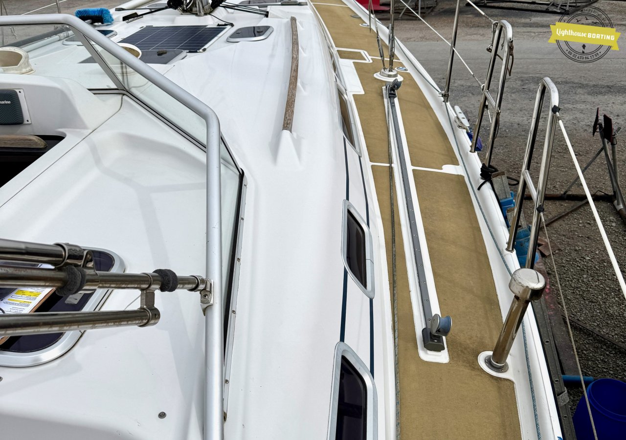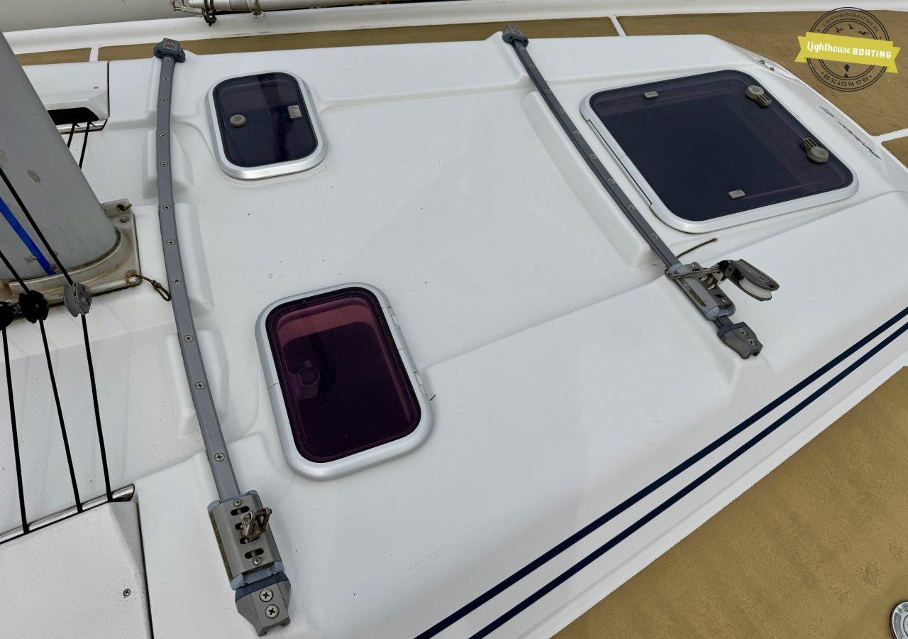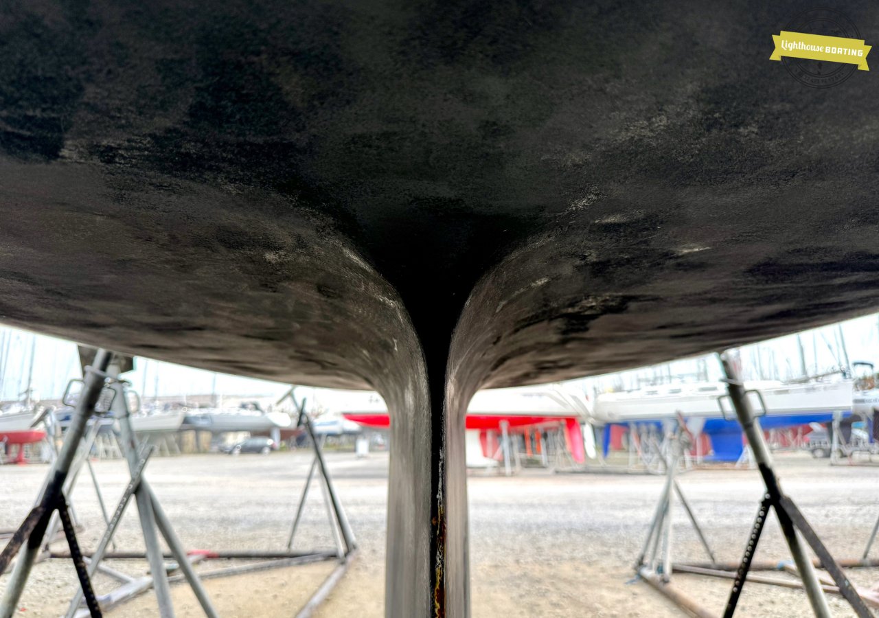 Hull and Construction: The hull is a white round-bilge GRP (polyester) construction. Notably, the hull was stripped and re-treated with epoxy in 2021. It features a fixed lead keel with a draught of 1.95 meters.